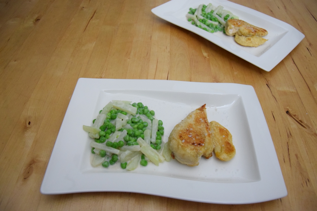 Die Kohlrabi werden mit den Erbsen in einer béchamelähnlichen Sauce angemacht und mit den angebratenen Hühnerbrüstln serviert.
