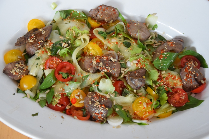 Ein kaltes Gericht für die Sommertage. Bei diesem Gericht wird die Schärfe des Salats durch die erkaltete Hühnerleber abgelöscht, aber auch durch die in feine Streifen geschnittene Salatgurke.