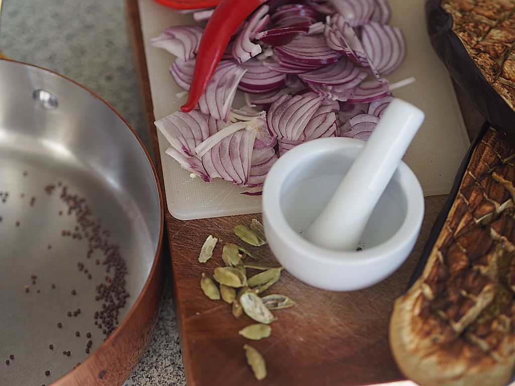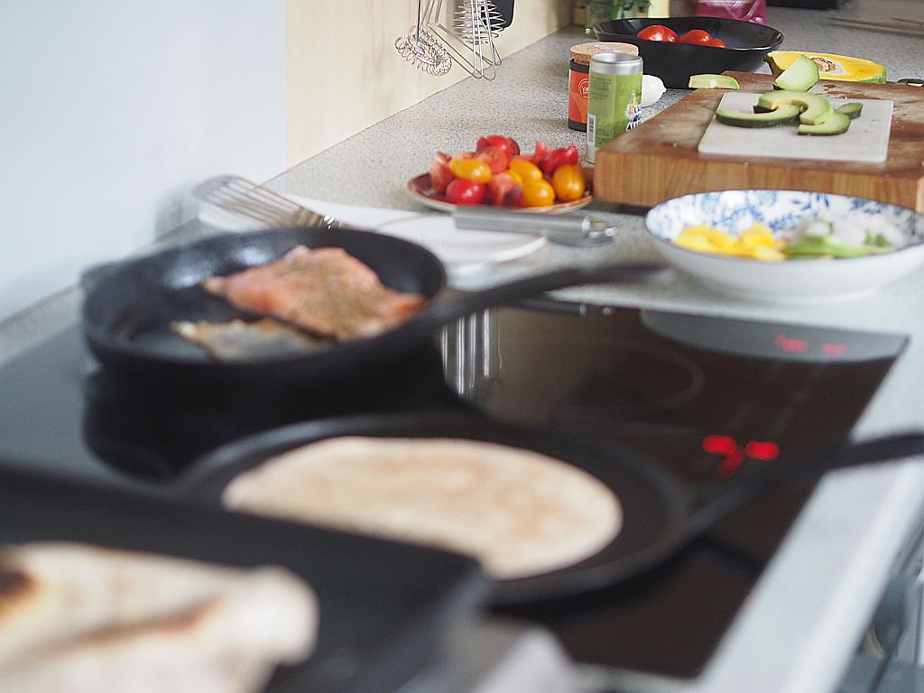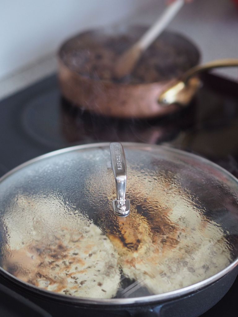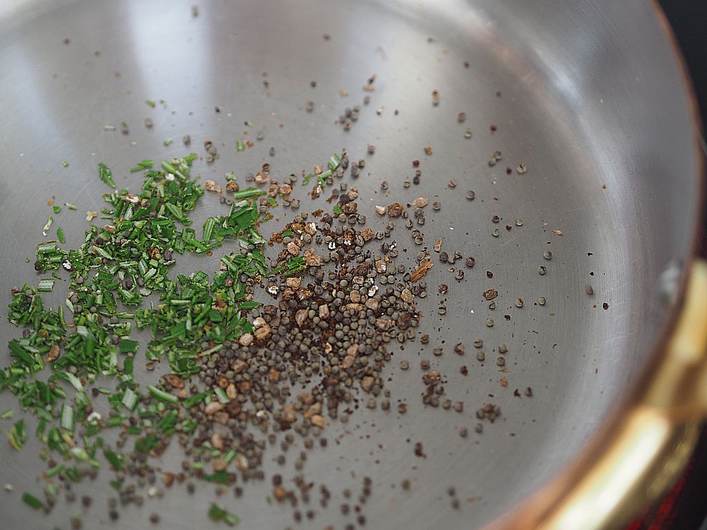 Rezept Schweinskoteletts mit Pfirsich & Whisky in Jamie Oliver, 5 Zutaten Küche, S. 216. Bei uns sind es 6 Zutaten , denn bei uns kamen noch die Erdäpfel dazu. Jamie schreibt, man soll das Ausgelassene vom Fettrand, der extra gebraten wird, für ein anderes Gericht verwenden. Das taten wir dann auch, wir nahmen es, um darin die Erdäpfel zu braten!