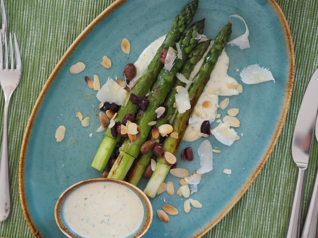 Für die Hühnerbrust eine Marinade vorbereiten: Sojasoße, Olivenöl, Senft und Salz. Darin die Hühnerbrust einlegen und eine Dreiviertelstunde marinieren. In der Zwischenzeit die Paprikaschoten entkernen und auf ein Backblech legen. Im Ofen mit dem Grill von oben grillen bis die Haut schwarz ist. Die Haut abziehen und auf die Seite stellen. Dann das Avocadojoghurt zubereiten: die Avocado schälen, in eine Schüssel geben, mit einer Gabel zerdrücken. Sauerrahm, geriebener Knoblauch, Salz, Zitronensaft und gewürfelte Tomatenstücke dazugeben und verrühren. Die marinierte Hühnerbrust in der Skeppshult-Pfanne goldbraun braten. A n r i c h t e n Die gegrillten Paprika auf den Teller legen, die Hühnerbrust in Scheiben schneiden und auf die Paprika legen. Auf das Avocadojoghurt getrocknete Chiliflocken streuen.