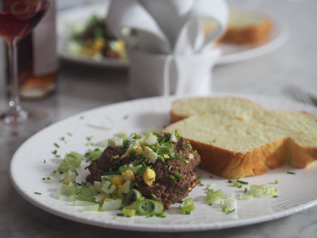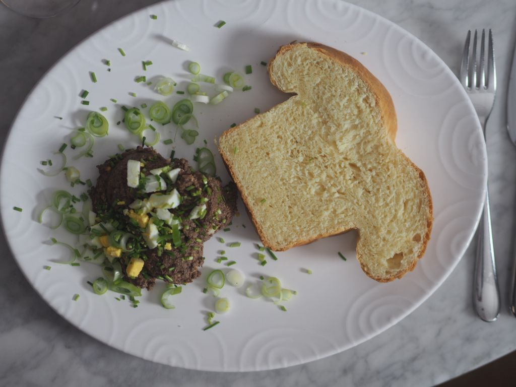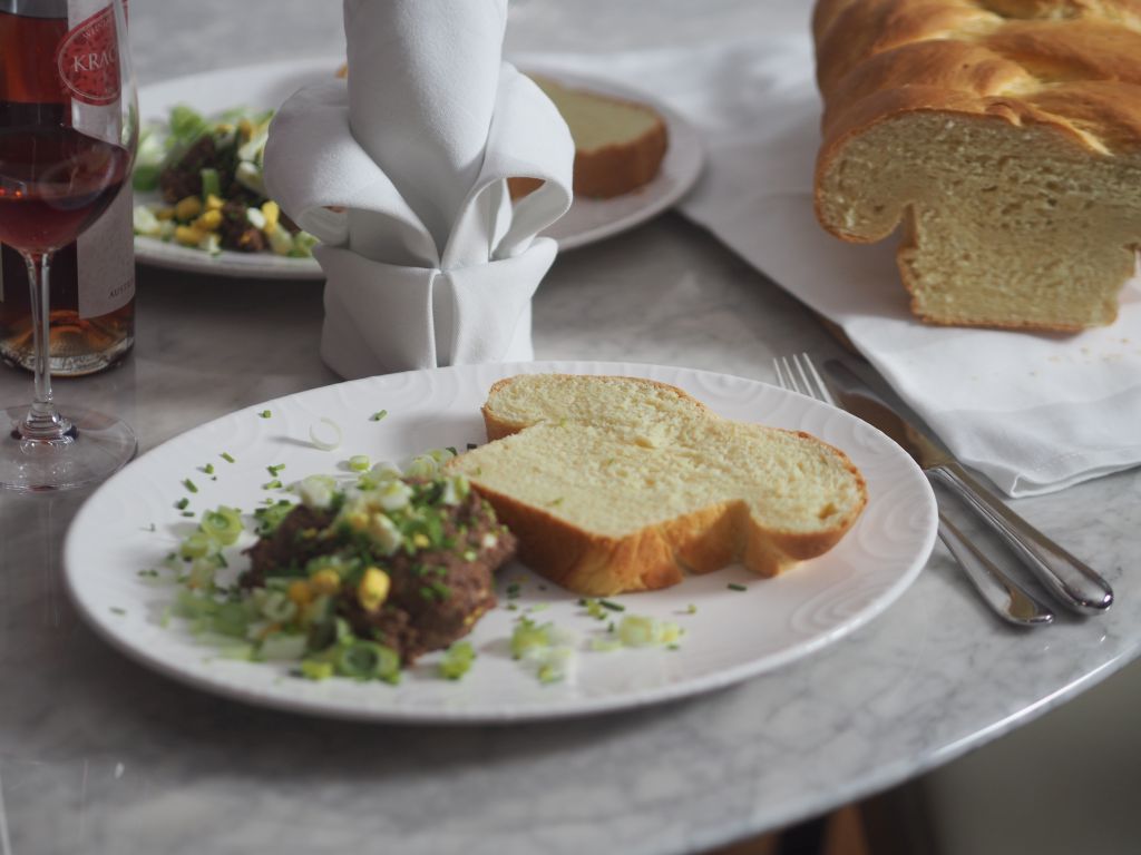 Beim Durchblättern des Jerusalem-Kochbuchs von Ottolenghi, auf der Suche nach einem typisch jüdischen Rezept, stieß ich auf die „Gehackte Leber“. Endlich habe ich ein Rezept gefunden, für die berühmte Jiddische Hühnerleber in einem echten Kochbuch! Ja wie macht es denn der Ottolenghi? Im Unterschied zu dem von uns zusammengeschusterten Rezept, siehe hier, fiel uns der Süßwein auf, der da hineinkommt. Dazu kam für uns kein Geringerer als der vom Weinlaubenhof Kracher in Frage, „Red Roses“ Rosenmuskateller Beerenauslese, 2019. Kracher ist der Süßweinproduzent Österreichs schlechthin! Bei gurkerl. at wird er als einer der drei Besten der Welt angepriesen!1. Und daran, das heißt an der Beigabe von Süßwein, möchte ich auch die Ursache festmachen, daß dieses Rezept so formidabel gemundet hat. Die Küchenfee sagte, diese gehackte Leber sei viel besser, als die wir im Gasthaus „Zur Dankbarkeit“ bekommen haben,- und das heißt was! Dazu gab es Schabbatbrot, selbstgemacht. Es ist ein regelrechtes Vergnügen, dem Teig dabei zuzusehen, wie er aufgeht.