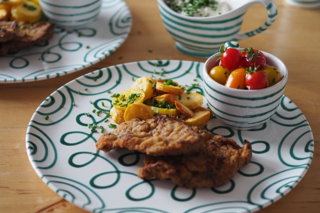 In der Fleischerei Ringl wurde der Kalbsschopf schon vorbereitet, sodaß man ihn nur mehr füllen mußte. Deshalb geht es los mit der Füllung 140 Grammgeriebener Pecorino (Schaf-Hartkäse) mit drei Eßlöffel gehackten Kapernbeeren mit 80 Gramm gehackten Taggiasche-Oliven, acht getrocknete gehackte Tomaten, drei Eßlöffel geröstete Pinienkerne , sechs geriebene Knoblauchzehen, eine gewürfelte rote Paprika, von einer Zitrone den Schalenabrieb und das gestückelte Filet und einen Bund gehacktes Basilikum, Petersilie, Oregano zu einer groben Paste verrühren. Das Fleisch ausrollen, auf beiden Seiten salzen und pfeffern. Auf der Schnittseite die Füllung bestreichen, zusammenrollen und mit Küchengarn, den wir von der Fleischerei bekommen haben, befestigt. Sauce Die in der Fleischerei ausgelösten Knochenstücke in einer Bratpfanne scharf anbraten. Das angeröstete Gemüse dazu geben: Karotte, Petersilienwurzel, Sellerie, Fenchel, Porree, Zwiebel, Knoblauch. Kurz scharf mitrösten. Mit Noilly Prat ablöschen, einköcheln und einen halben Liter frisch gekochte Rinderbrühe dazu gießen (um die Rinderbrühe vom extra gekauften Beinfleisch zu machen: bitte extra eine Stunde früher aufstehen, am Sonntag). Parallel auf der Grillplatte die gefüllte Schopfrolle auf allen Seiten scharf anbraten, dann in den Bräter heben und die Grillplatte mit Noilly Prat ablöschen, um die Bratenreste abzulösen und in den Bräter zu gießen. Dann bei 180 Grad zweieinhalb Stunden ins Backrohr geben. In dieser Zeit den Rollbraten zweimal drehen und mit der Rinderbrühe nachgießen, falls notwendig. Anrichten Aus dem Ofen nehmen, herausheben und warmstellen, die Sauce durch ein Sieb abgießen und mit Stärke binden. Mit Braterdäpfeln und dazu Kohlchips, wie hier.