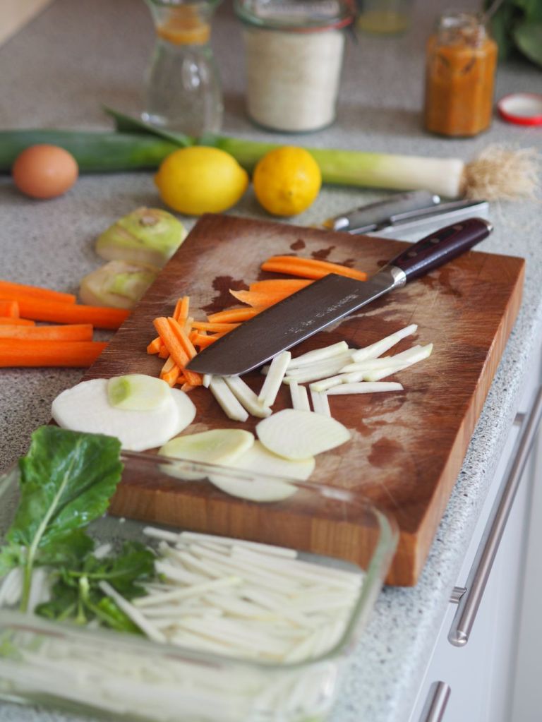 Wurzelgemüse Zwei Kohlrabi und sechs Karotten putzen und in Stifte schneiden. Das kann eine Weile dauern, deshalb legen wir die Stifteln in Eiswasser, damit das Gemüse nicht braun verfärbt. Einen Esslöffel Olivenöl in eine Pfanne geben, erhitzen und darin das Gemüse anschwitzen. Dann 100 Milliliter Gemüsebrühe dazu geben und zirka acht Minuten bei schwacher Hitze dünsten. In der Zwischenzeit Lauch in dünne Scheiben schneiden und zum Gemüse geben, ein paar Minuten mitdünsten. Mit Salz, Pfeffer und Muskatnuß abschmecken. Mit grob gehacktem Koriander vermengen und auf dem Teller anrichten. Die Grießnockerl dazu geben.