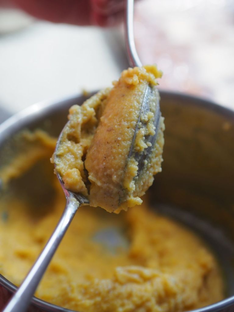 Grießnockerl 100 Milliliter Gemüsebrühe mit 20 Gramm Butter aufkochen. 60 Gramm Weizengrieß unterrühren. Vom Herd ziehen und weiterrühren, bis sich der Teig vom Topfboden löst. Auskühlen lassen. Ein Ei und 10 Gramm angeröstete Sesam einrühren. Die Nockerl mit zwei nassen Löffeln formen und ins siedende Wasser tauchen. 10 Minuten ziehen lassen.