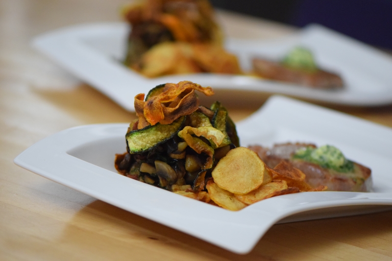 Rübchen, Zuckererbsen, Speck, Karotte, Schweinskarree. Alles gegrillt. Dazu Kartoffelpüree.
