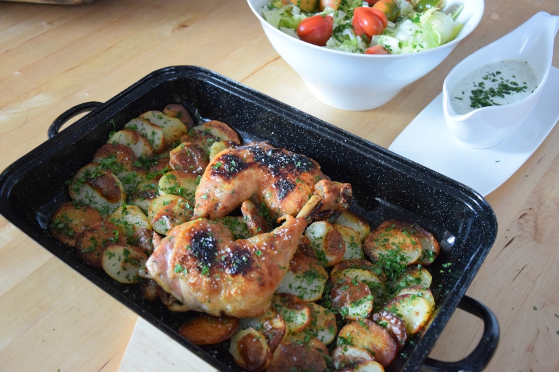 Die Hühnerkeulen wurden aromatisiert mit Knoblauch, Thymian, Lorbeer und Pfeffer. Dazu Ofen-Erdapfelscheiben mit fein gehacktem Knoblauch und Petersilie.