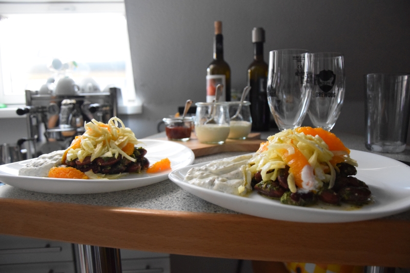 wobei der Kartoffelstampf ungarisch mit geräuchertem Paprikapulver war und die Makrele nordafrikanisch mit Chermoula mariniert.