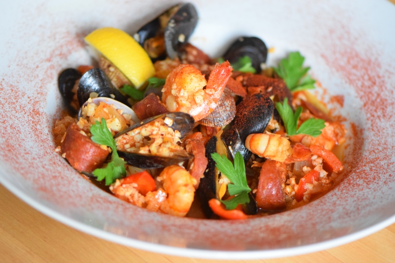 Statt dem Reis gibt es Blumenkohlröschen in dieser Paella. Aber sonst ist alles wie bei einer richtigen Paella, sogar mit den spanischen Produkten Chorizo und Paprika de la Vera, edelsüß und geräuchert. Dazu Venusmuscheln, Miesmuscheln und Garnelen.