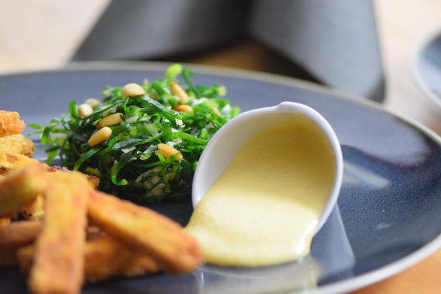 Statt Pommes Frites gibt es Légumes Frites. Und statt Mayonnaise gibt es eine katalonische Quitten-Aioli, dazu Mangold-Salat. Fast Food als Delikatess‘.
