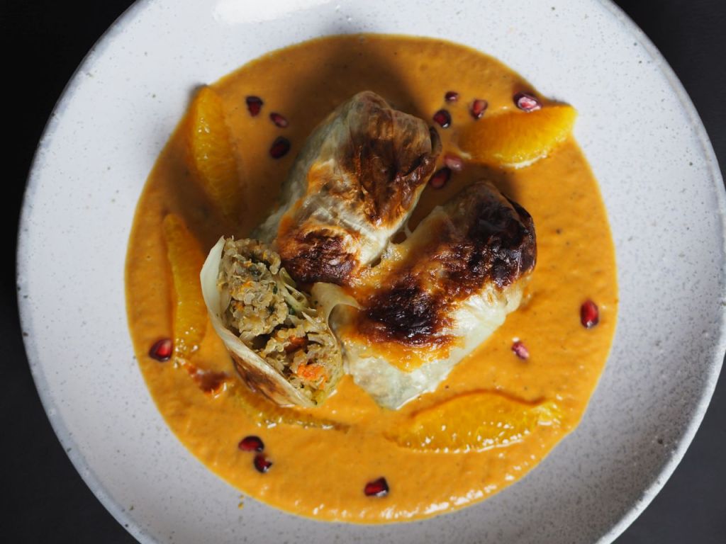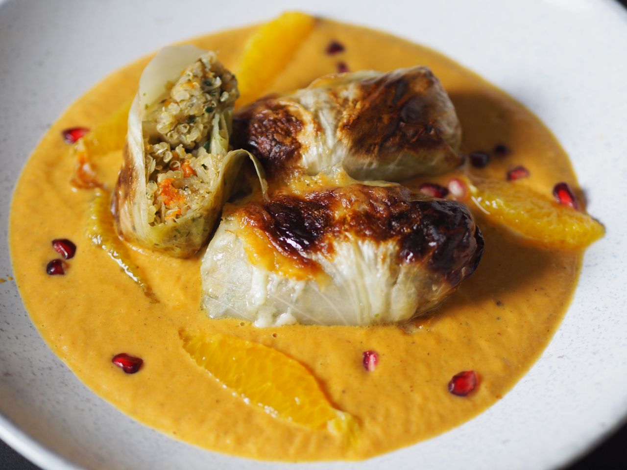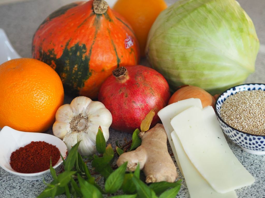 Rahmkraut ein halbes Krauthappl in Rauten schneiden in der Pfanne drei Eßlöffel braune Butter erhitzen und einen Eßlöffel Honig dazu geben, karamellisieren lassen, mit einem Eßlöffel Weißweinessig ablöschen, das Kraut dazu geben, salzen nicht vergessen und zehn bis 15 Minuten dünsten. Zum Schluß einen Becher Schmand einrühren mit Salz und Pfeffer abschmecken und nochmal fünf Minuten bei kleiner Flamme ziehen lassen. Kalbspieße Kalbfleischstücke auf Holzspieße spießen. Kurz vor dem Servieren die Grillplatte mit brauner Butter bestreichen, erhitzen und die Kalbspieße kurz darin anbraten, nicht zu lange, Kalb ist sehr empfindlich.