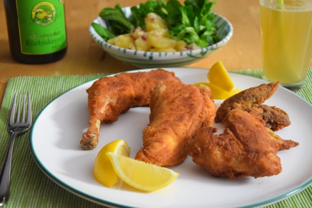 Wer ein Wiener Backhendl also Poulet frit à la Viennoise mit Pommes frites haben will, bedenke: zwei Mal fritiert ist ein Mal zu viel des Guten, da geht die Panier geschmacklich unter. Am besten schmeckt es ganz klassisch mit einem Kartoffelsalat, da kann das Backhenderl aufleben.