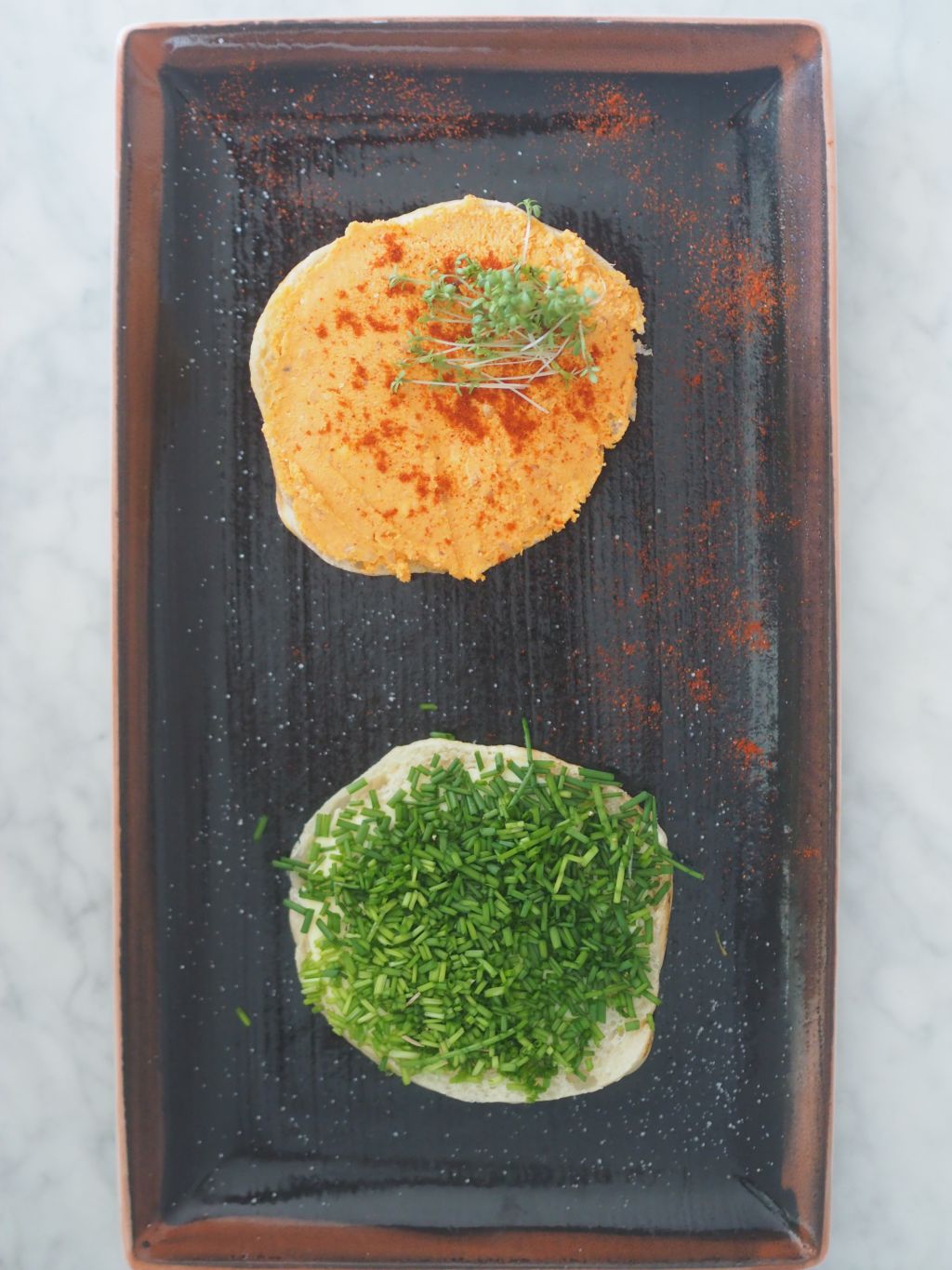 T o u r n e d o s mi einem Küchengarn in Form bringen. A p f e l k r e m e Gala-Äpfel schälen entkernen, würfeln. Butter, Wermuth, Zitronensaft, Honig und Salz in einer Kokotte leise köcheln lassen. Vom Herd ziehen und mit dem Handmixer pürieren und durch ein feines Sieb streichen. Im Kühlschrank auskühlen lassen. E r d ä p f e l c h i p s Die Laura-Erdäpfel auf der Mandoline länglich dünn hobeln. Die Scheiben in eiskaltes Wasser legen und ziehen lassen. Abtrocknen. In einer Pfanne mit einem Hauch Olivenöl braten. Mit Küchenkrepp abtrocknen, auf die Seite stellen. Kohlsprossen auf Blätter teilen. Kurz blanchieren. Trocken tupfen. Warm halten. T o r n e d o s mit einem Hauch Olivenöl in einer Pfanne erhitzen. Tournedos scharf anbraten, damit sie Farbe nehmen. Zum Schluß aromatisieren: Butter und Rosmarin und Thymian in die Pfanne geben und die Tournedos mit einem Löffel übergießen. Anschließend die Tournedos mit dem Rosmarin im Backrohr vorgeheizt auf 180° legen, ganz wichtig, darunter eine Auffangform, eine Alufolie legen, damit der Saft aufgefangen wird. S o ß e In einer kleinen Bratpfanne den Bratenansatz mit Port ablöschen, einköcheln, Rinderbrühe dazugießen. Fein gehackte Sommertrüffel dazugeben. Einköcheln lassen. Durch ein Sieb gießen und die Soße mit etwas Stärke binden. B r a t ä p f e l Dann einen roten Apfel achteln und das Gehäuse entfernen. In der Pfanne mit Butter goldbraun anbraten. A n r i c h t e n Die Tournedos auf dem Teller servieren. Die Apfelkreme dazu geben, einen kleinen Löffel Gänseleberpastete auf den Tournedos platzieren, die Braterdäpfel darauf legen. Kohlsprossenblätter sowie die Erdäpfelchips auch auf den Teller legen und mit der Soße begießen. Eine Trüffelscheibe auf die Tournedos legen.