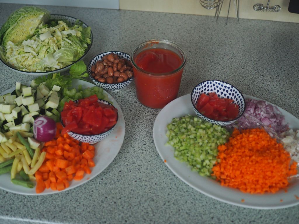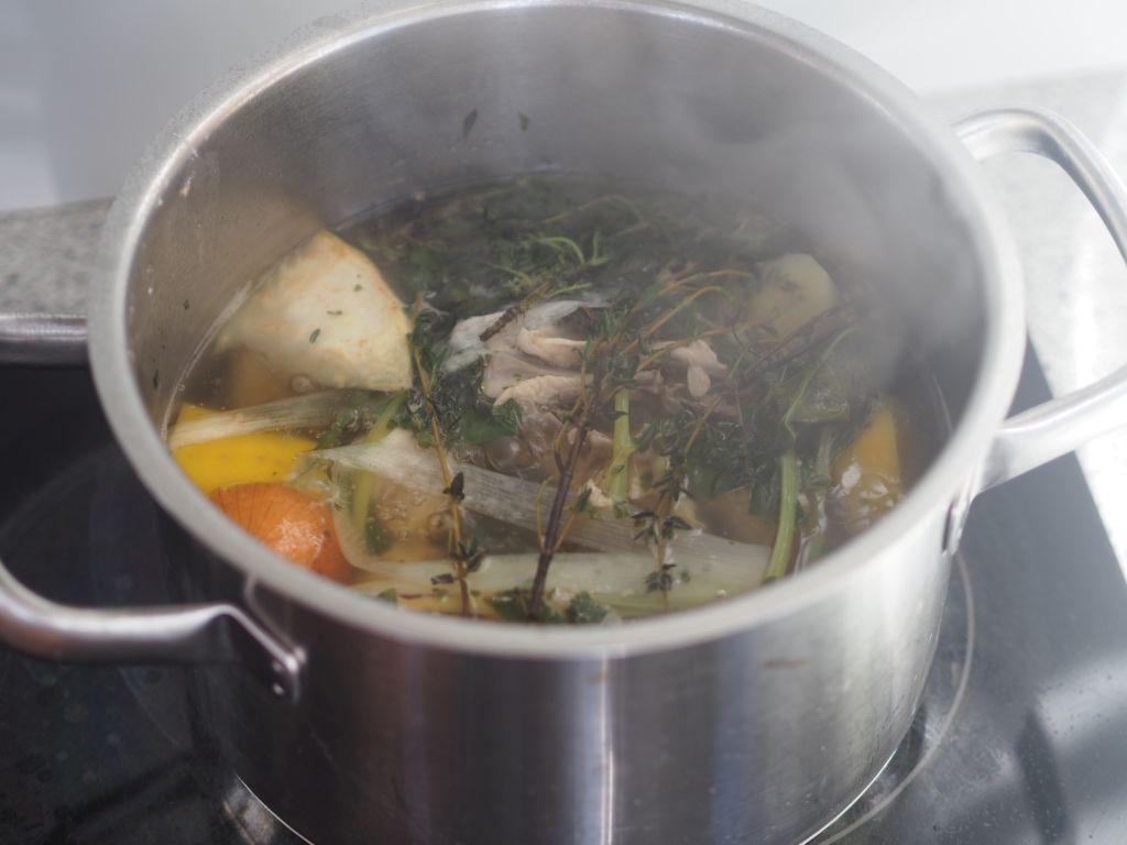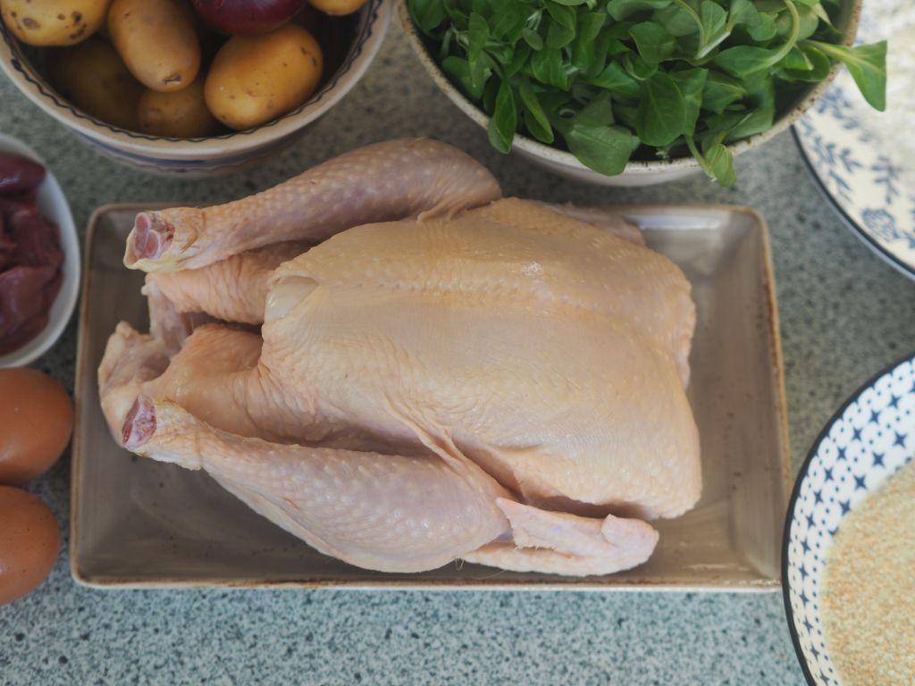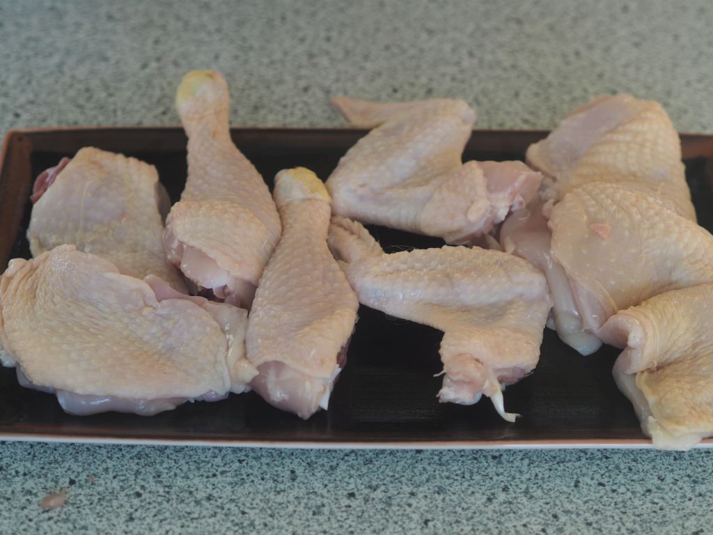 Nach gutem alten Brauch haben wir gleich ein ganzes Hendl gekauft, nicht nur die Schenkel;- solche Henderln, die nur Füße haben, gibt’s net. Zum Herausbacken wurden verwendet: die Flügerl, die Schenkel, die Brust, die Leber und das Herz. Mit den anderen Teilen wurde eine Suppe aufgesetzt, die gibt’s dann ein anderes Mal. Dann ist die Frage zu klären, ob man es lieber mit oder ohne Haut haben will. Klassisch ist‘s mit Haut, die Küchenfee mag es lieber ohne, also wurden ein paar Teile mit und ein paar ohne Haut zubereitet.