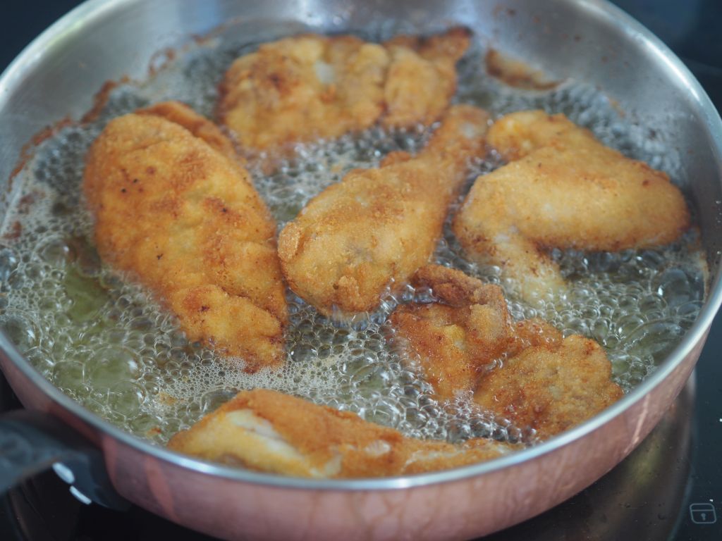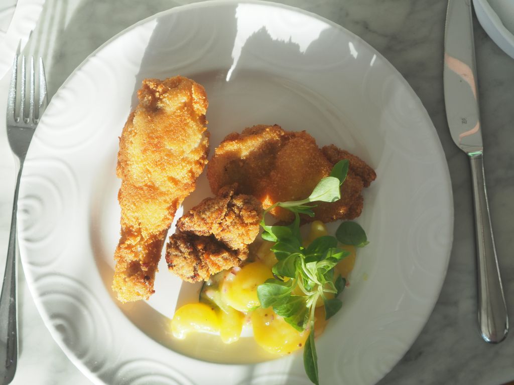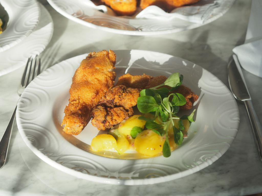 Wer ein Wiener Backhendl also Poulet frit à la Viennoise mit Pommes frites haben will, bedenke: zwei Mal fritiert ist ein Mal zu viel des Guten, da geht die Panier geschmacklich unter. Am besten schmeckt es ganz klassisch mit einem Kartoffelsalat, da kann das Backhenderl aufleben.
