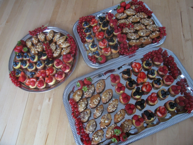 Da der Abend eines Festes oft lange ausklingt, ergänzten wir die Nussschiffchen mit Beeren-Tartelettes. Tartelettes sind kleine Törtchen. Wir machten sie noch kleiner als im Rezept vorgesehen. Und hatten so kleine Häppchen, die man mit einem Bissen verschwinden lassen konnte. Oh! Sweet Fingerfood.