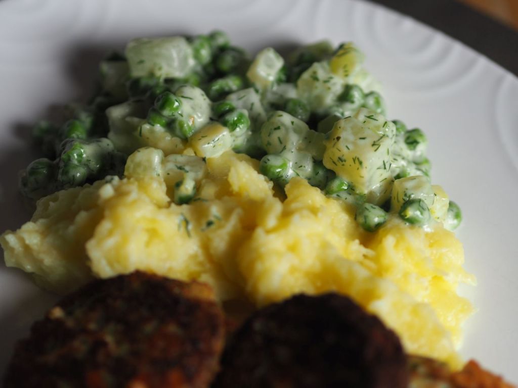 K o h l r a b i – E r b s e n – A u f l a u f 3 Kohlrabi und 3 Karotten würfeln und in Gemüsebrühe bißfest kochen. In den letzten Minuten 300 g TK-Erbsen dazugeben, abgießen und abtropfen lassen. 200 ml Sahne mit 4 kleinen Eiern (Größe M) , Muskatnuß, Salz 2 EL gehackte Petersilie vermischen. 400 g Rinderhackfleisch mit 3 EL Haferkleie, 150 g Frischkäse, 1 EL Senf, Salz und Pfeffer verrühren, gut durchkneten und kleine Bällchen formen, das gekochte Gemüse in eine feuerfeste Form geben, die Bällchen schön auf das Gemüse legen und das Ganze mit der Sahnesoße begießen und mit geriebenem Old Amsterdam bestreuen. Im Ofen bei 180° braten bis der Käse auf den Fleischbällchen schön goldbraun ist.