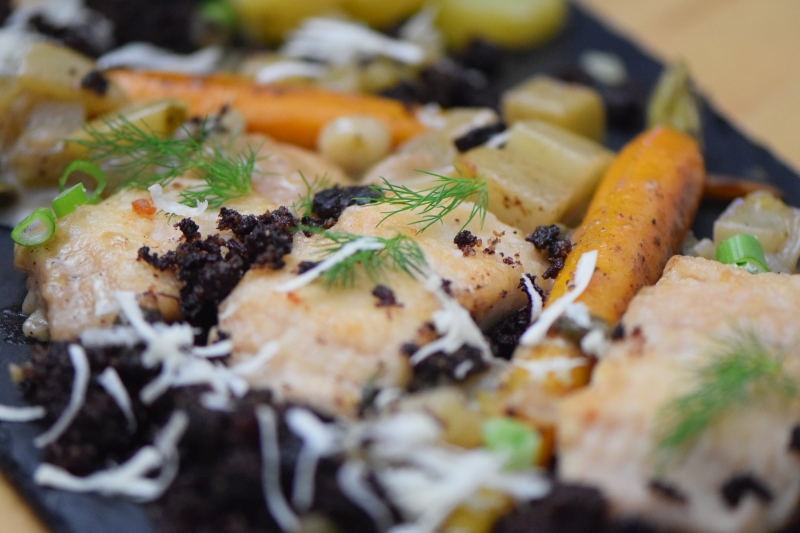 die Blunzn (Blutwurst) war mit Semmelbröseln gemischt und Gurkenscheiben abgeschmeckt. Dazu gedünstete Frühlingszwiebel, Kohlrabi und Möhren.