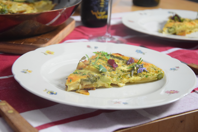 Eine Rindsuppe aufsetzen und 3 Stunden köcheln lassen. Abgießen. Mit der Fetttrennerkanne nur die Brühe nehmen. Diese Brühe soll kräftig sein, Piment, Wacholder, Muskatnuß, Lorbeer, Thymian, Rosmarin verwenden und viel Rindsknochen: 0,8 kg. 2kg Erdäpfel „Laura“ schälen, im Fleischwolf mit dem Aufsatz für Scheiben durchjagen. Ebenso 8 mittelgroße Zwiebel. Die Paella-Pfanne ausbuttern. Die Erdäpfelscheiben fächerweise auflegen, dann eine Schicht Zwiebel. Salzen und mit frisch gehacktem Thymian bestreuen. Dann zwei mal: eine Schicht Erdäpfeln und dann wieder Zwiebel, zum Schluß eine Schicht Erdäpfel. Mit Rinderbrühe begießen. Die Kunst ist, nicht zu wenig Brühe zu nehmen, hängt davon ab, wieviel die Erdäpfel aufnehmen. Bei uns ergab das 600 ml. Ein paar Butterflocken darauf legen und bei 180°C eine Stunde goldbraun backen. Vor dem Servieren mit Mikrogreens Kapuzinerkresse und Radieschensprossen bestreuen.