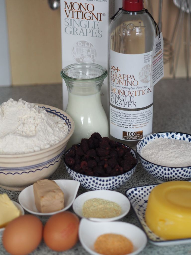 Die getrockneten Himbeeren eine Dreiviertelstunde in Grappa einlegen. Die Germ in Milch auflösen. Mehl, Eier, Zucker Butter, den Abrieb einer Orangen- und Zitronenschale und Salz vermischen. Den in Milch aufgelösten Germ dazu geben. Einen flüssigen Teig kneten. Die Himbeeren dazugeben. Den Teig fünf Stunden gehen lassen. (In der Zwischenzeit z.B. ein Museum besuchen.) Den Teig nochmal zusammenschlagen. Mit einem Löffel kleine Batzen abnehmen und im heißen Butterschmalz bei rund 160 Grad herausbacken. Die Löffel nicht zu groß nehmen, um speckige Krapfen zu vermeiden. Und nicht zu heiß, damit die Krapfen nicht zu schnell braun werden, bevor sie innen durch sind. Anrichten Mit Vanillezucker bestreuen. Dazu einen Grappa servieren.