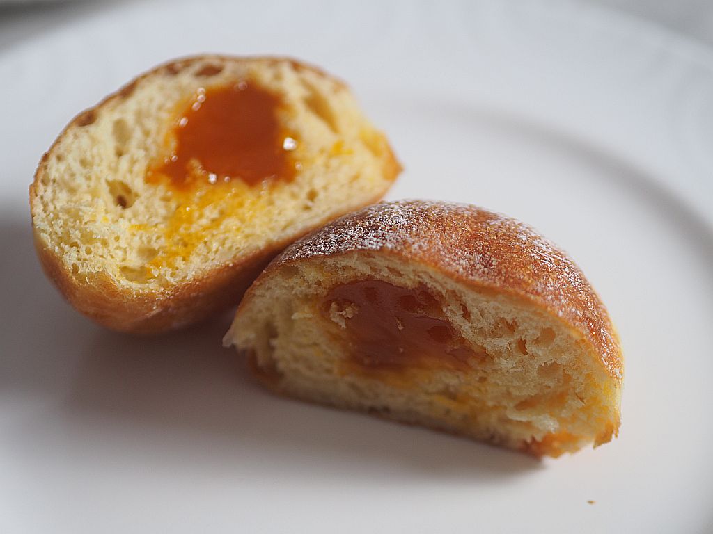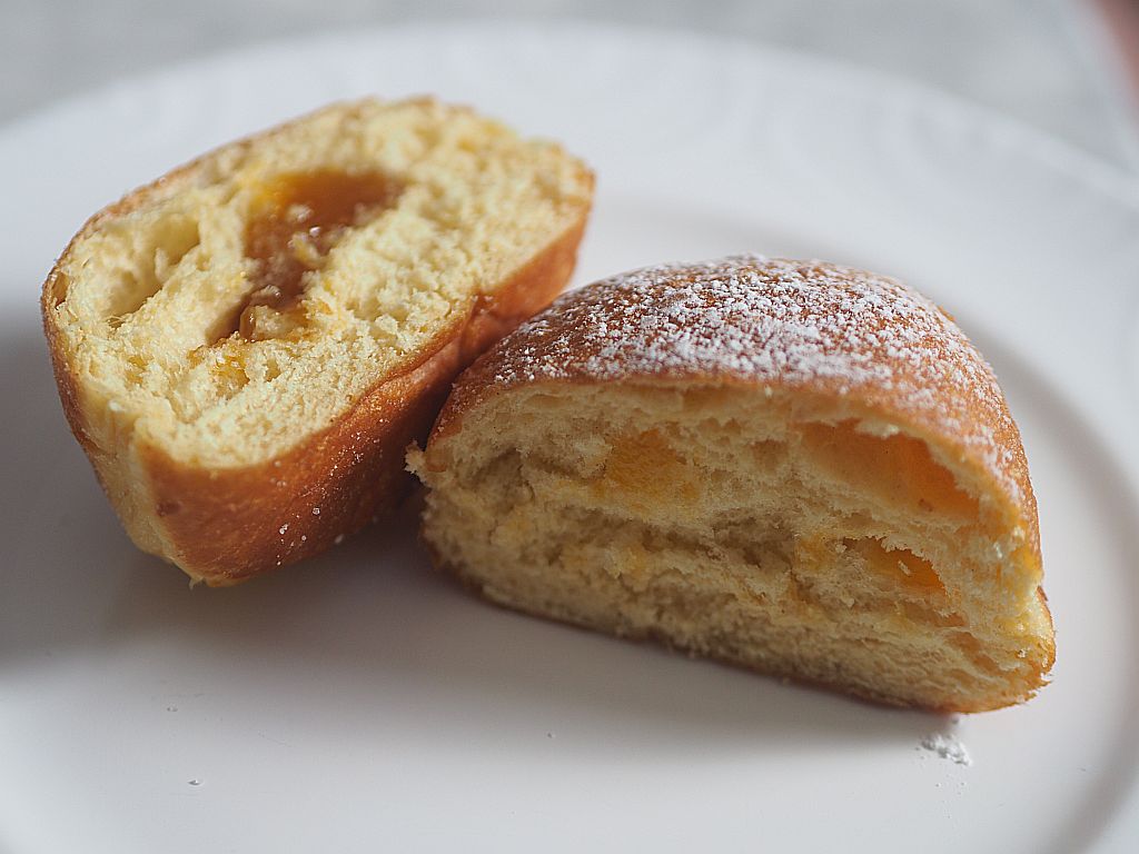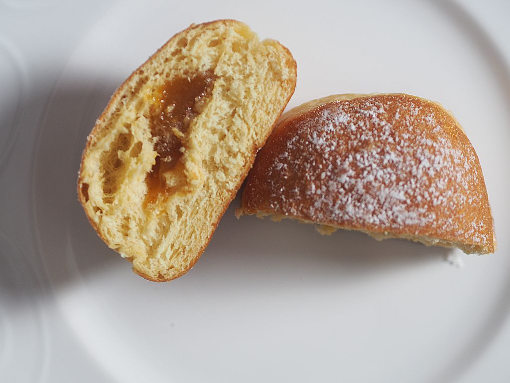 Der dritte Krapfen: etwas kleiner der Teig, aber mit Biß! Und viel Marmelade, man möchte mehr haben davon.