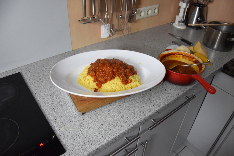 und frisch gemachten Tonnarelli. Dazu Kopfsalat.