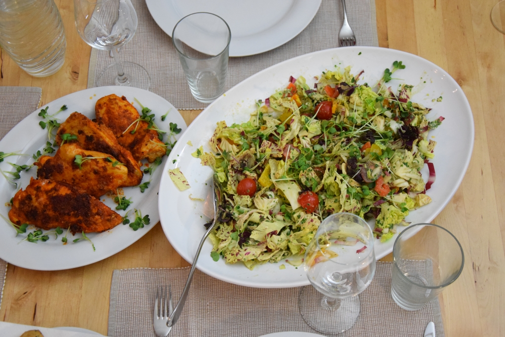 Topinambursuppe mit Lauch und Sellerie, als Hauptgang Cesars Salad mit Paprika, Joghurt-Dressing, Supremes – dazu Focacciabrot und als Nachspeise die Profiteroles mit Eis.