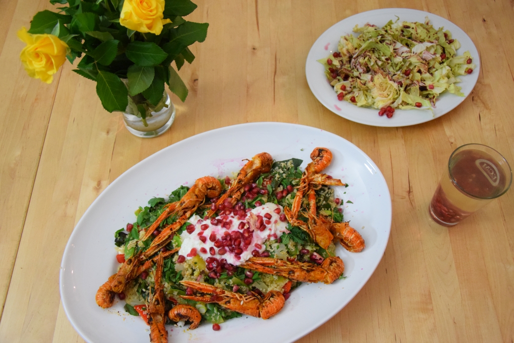 mit Granatapfel und Mangold, Stangensellerie, Frühlingszwiebel, breiten Bohnen, Paprika, Fenchel und Orangen.