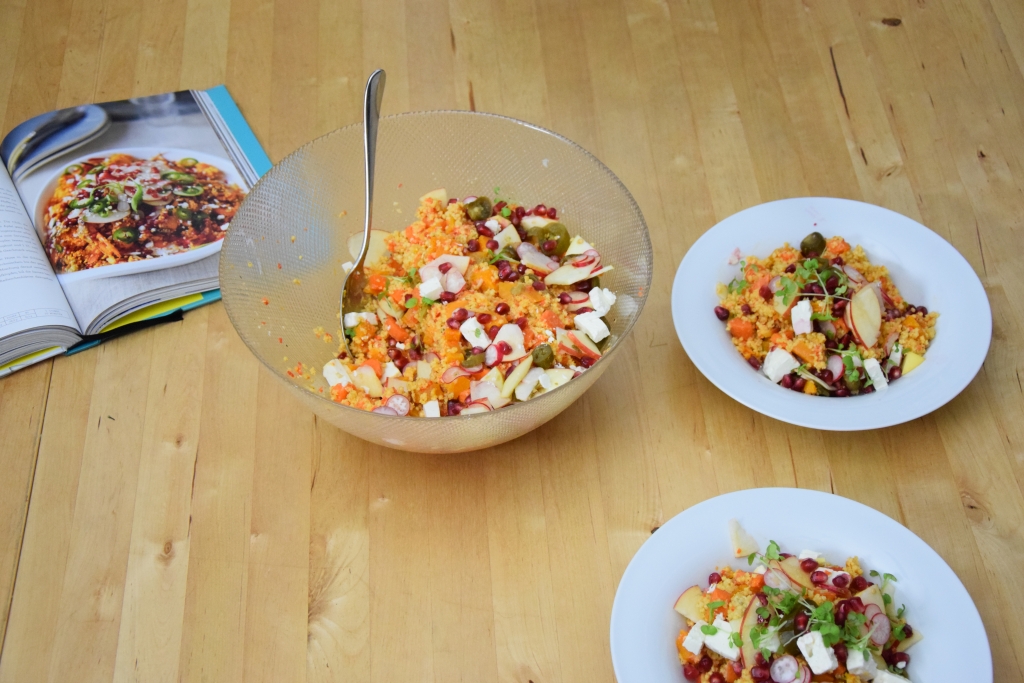mit Jalapenos und Granatäpfel, normalen Äpfel, Hirse, Radieschen, Paprika und einer Handvoll gerösteten Nüssen. Und Feta!