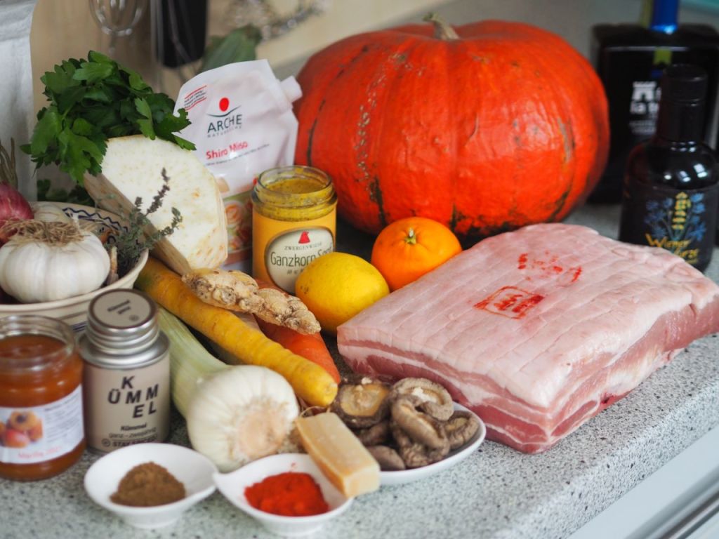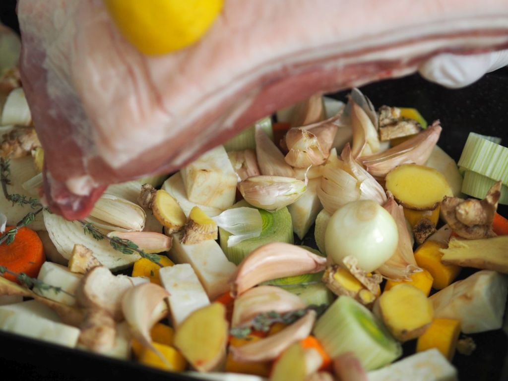 1,2 kg Schweinebauch vom Sonnenschwein, 2 Zitronengras, 12 Stück Knoblauchzehen, 1 Stück Ingwer, eine Handvoll grobes Meersalz, Noilly Prat.