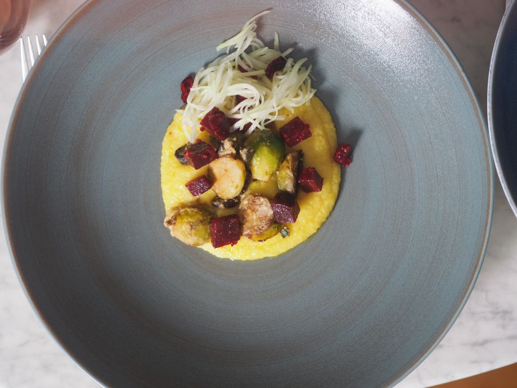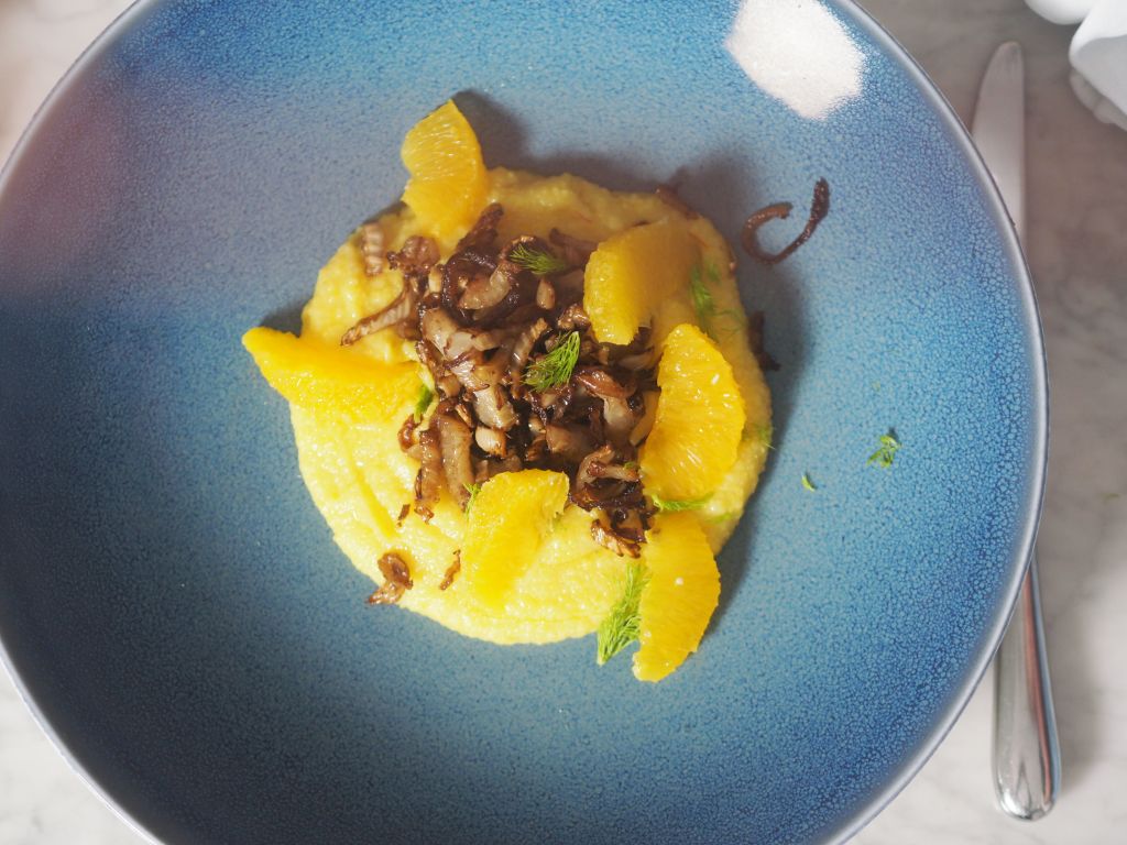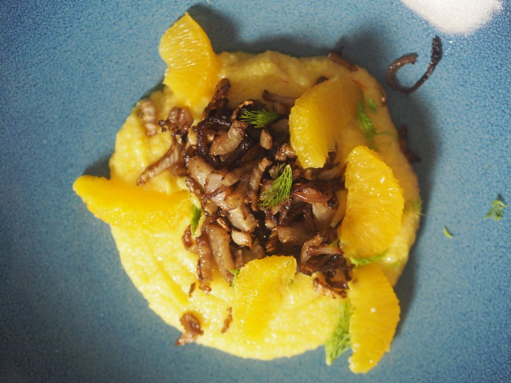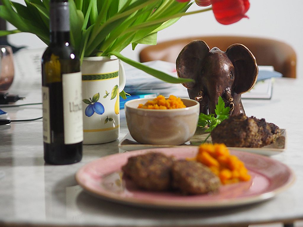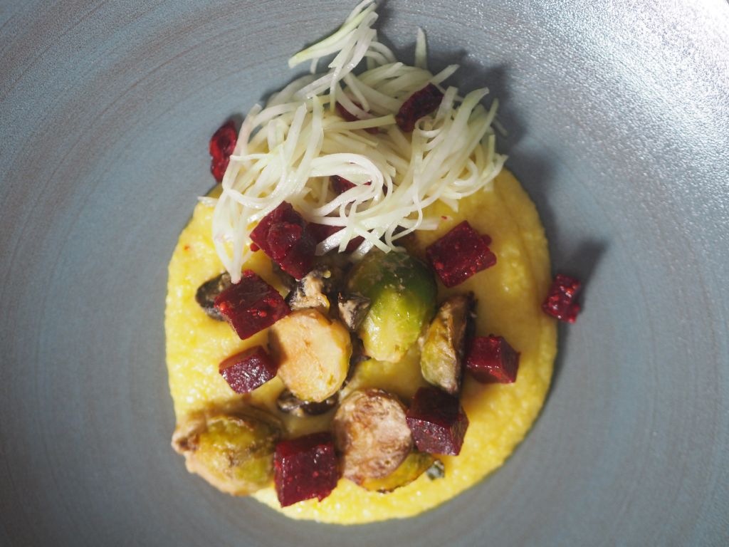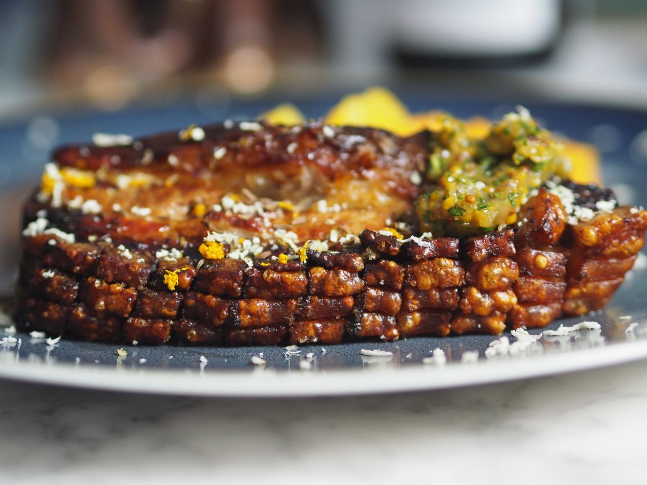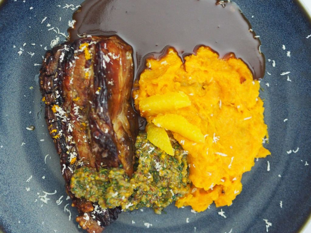 In manch Schule gibt’s kein Schweinefleisch mehr, das ist sehr bedauerlich. Wir können mit so viel alttestamentarischer Rückwärtsgewandtheit nicht wirklich was anfangen und lassen uns davon auch nicht beirren. Wir haben sogar einen Schritt vorwärts gemacht und den Schweinsbraten ein bisserl modernisiert. Unser Schweinsbraten war vom Sonnenschwein, einer Kreuzung aus Duroc (Nord-Europa) und Schwäbisch Hällisch (Deutschland/Schwäbisch Hall). Die Schwarte vom Bauchfleisch wird resch angebraten, damit es so richtig kracht beim Einebeißen. Es wird mit einer geschmeidigen Kürbiscreme serviert, dazu kommt ein Walnuß-Apfel-Crunch. Das Schwein selbst kommt aus der Südoststeiermark, an der Grenze zum Südburgenland, ungefähr auf der Höhe von St. Michael, und konnte dort die Erde umgraben. Ein Gemischter Satz aus Wien rundet die Sache ab, der kann auch ziemlich resch sein.