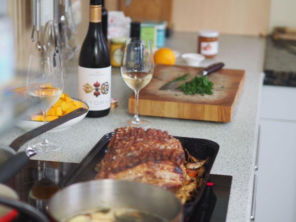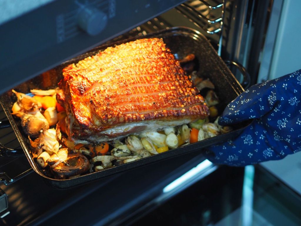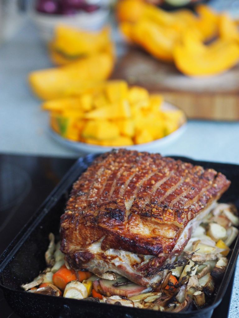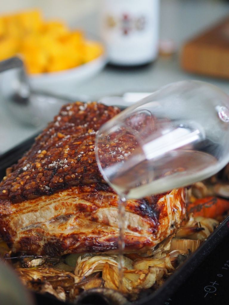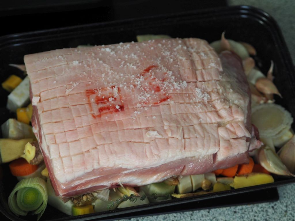 Damit der Schweinsbraten schön knusprig wird, hat ihn die Hofköchin mit Zitronensaft beträufelt, dann trocknen lassen, ihn mit grobem Meersalz bestreut und bei 240°C ins vorgeheizte Backrohr geschoben. Nach einer Stunde herausnehmen, das alte Salz obekletzeln und frisches Salz darauf gegeben und wieder ins Backrohr schieben, nach 20 Min. herausnehmen, das Salz heruntergeben, mit Noilly Prat aufgießen, aber nicht auf die Schwarte kommen, zurückdrehen auf 190°C, und eine halbe Stunde braten lassen.
