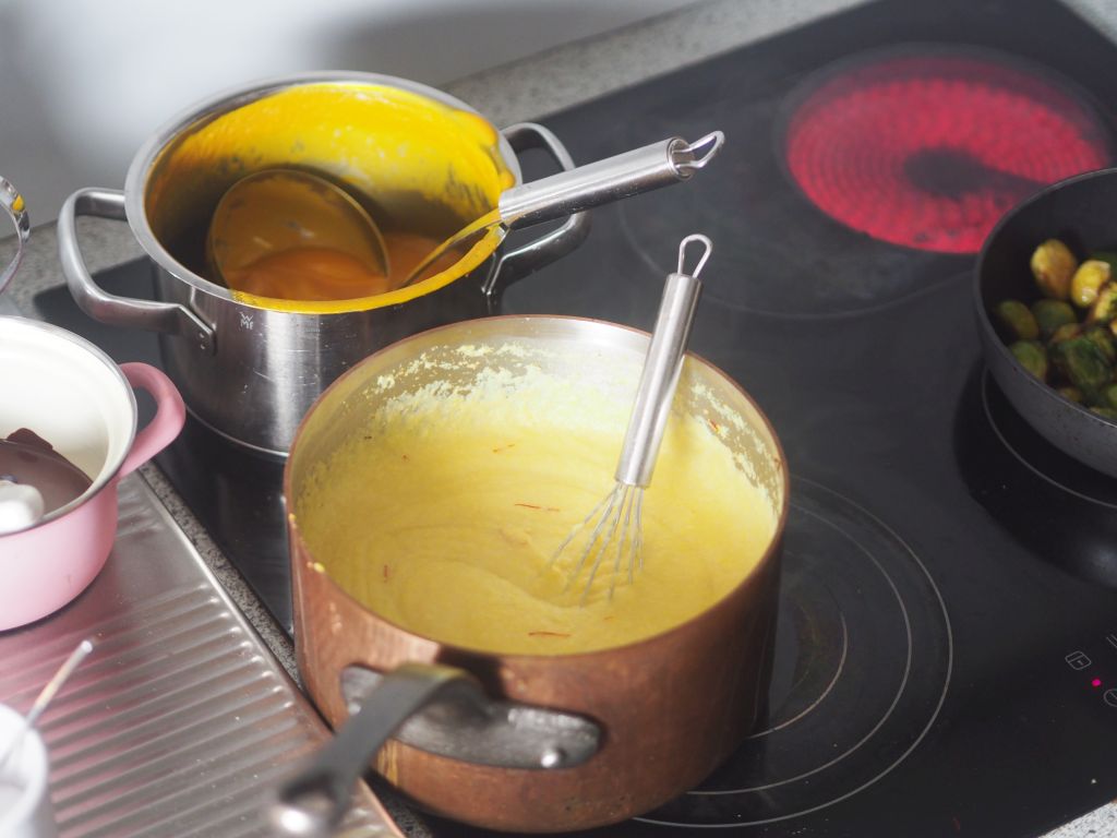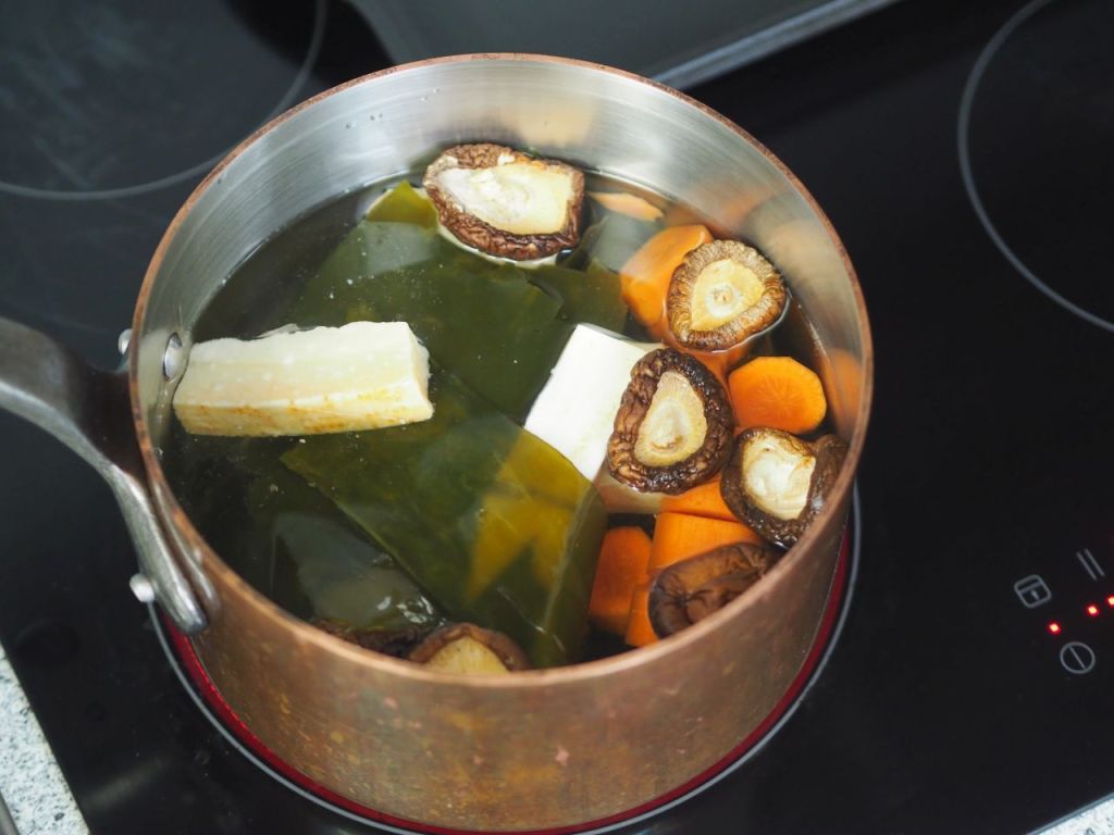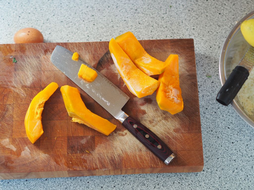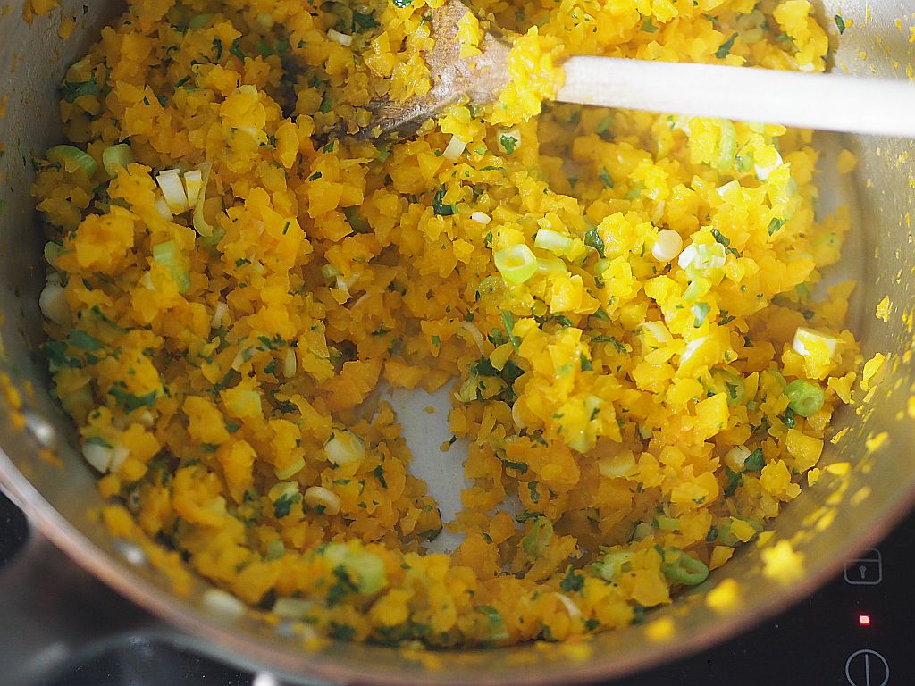 Kürbis schälen, Kerne entfernen, mit Salz und wenig Olivenöl vermischen. Zum Fleisch schieben bei 190°, bis es weich ist, etwa 25 min. Dann herausnehmen, das Gemüse in einen Topf geben, Butter hineingeben, sowie Misopaste, Mirin.