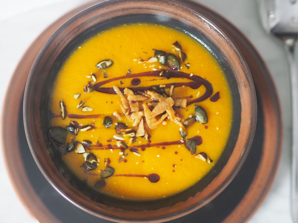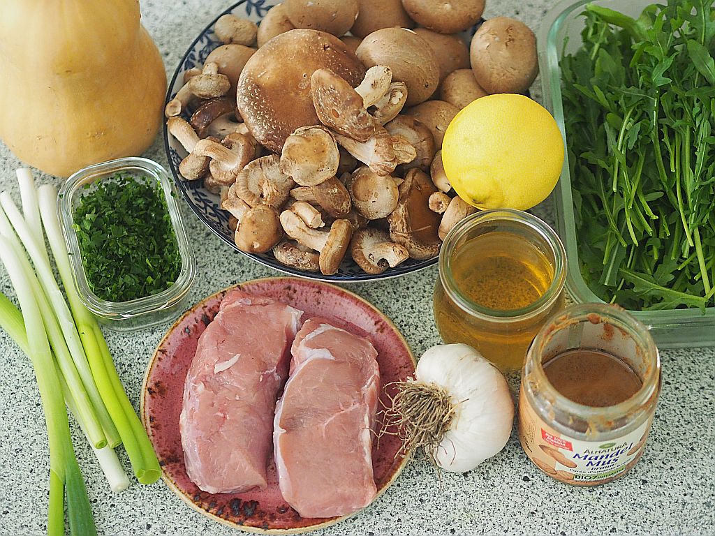 1 kg Butternußkürbis, etwas Olivenöl, 1 EL Butter, 2 EL Misopaste, 1 EL Mirin
