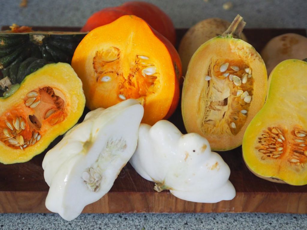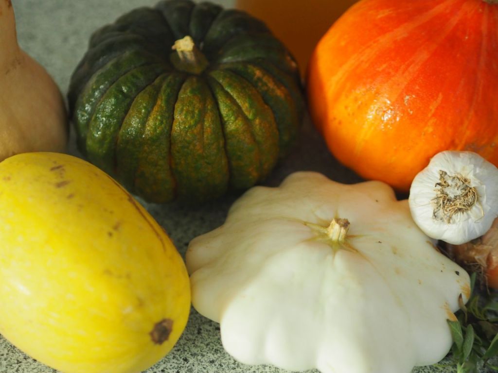 Spaghetti-, Butternuss-, Hokkaido-, Weißer UFO- und noch ein grüner Kürbis, dessen Namen wir nicht herausfinden konnten, vielleicht ist es der Muskatkürbis.