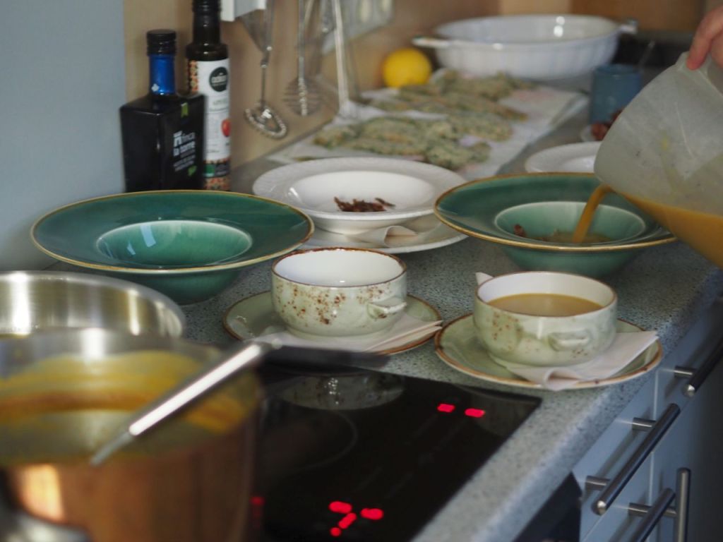 Fünf-Kürbissuppe anrichten, nicht mit dem Schöpflöffel, mit der Kanne wird die Suppe in die Teller geleert, wie in der Gastronomie.