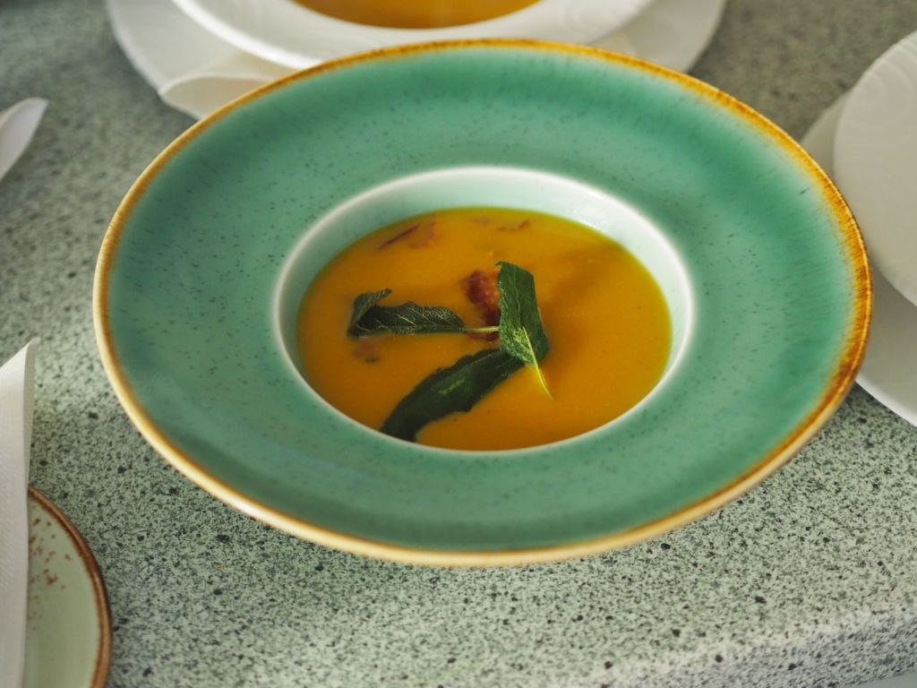 Fünf-Kürbissuppe mit frittiertem Salbeiblatt