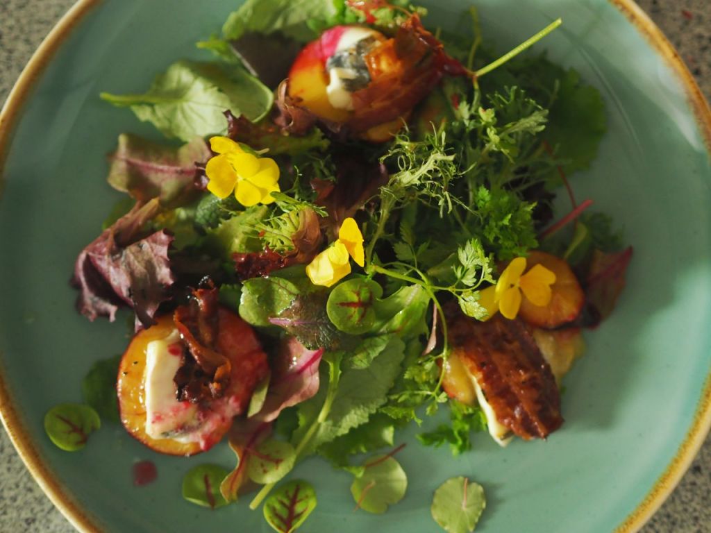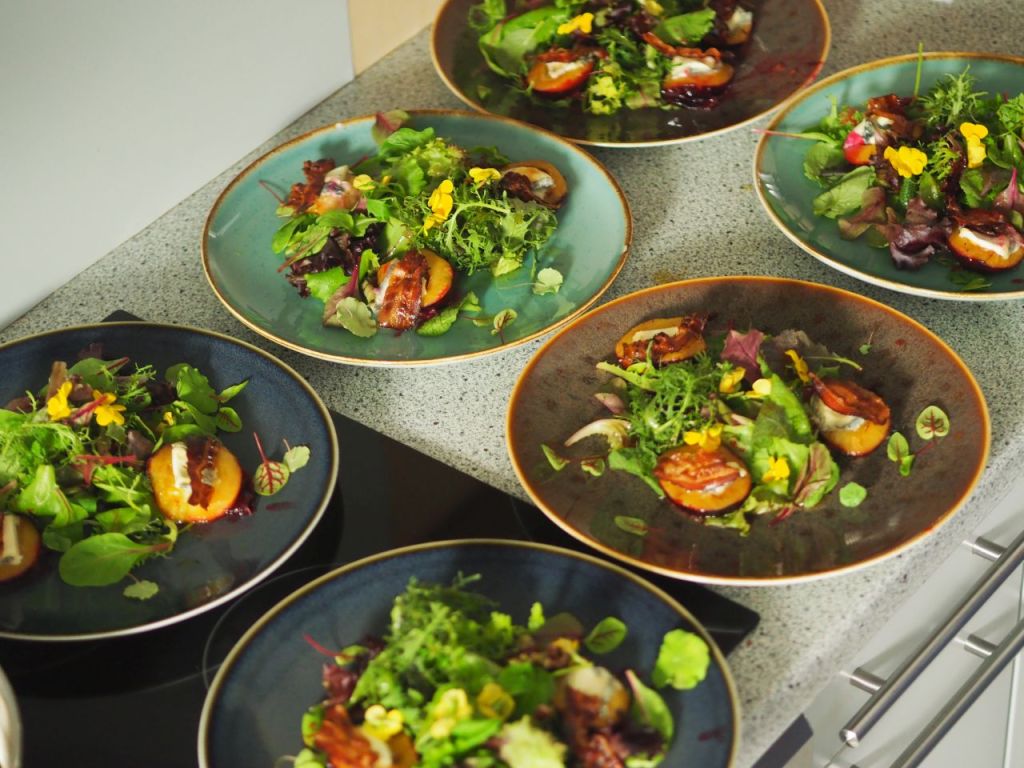 Mit Ziegenkäse überbackene Zwetschken und Wildkräutersalat