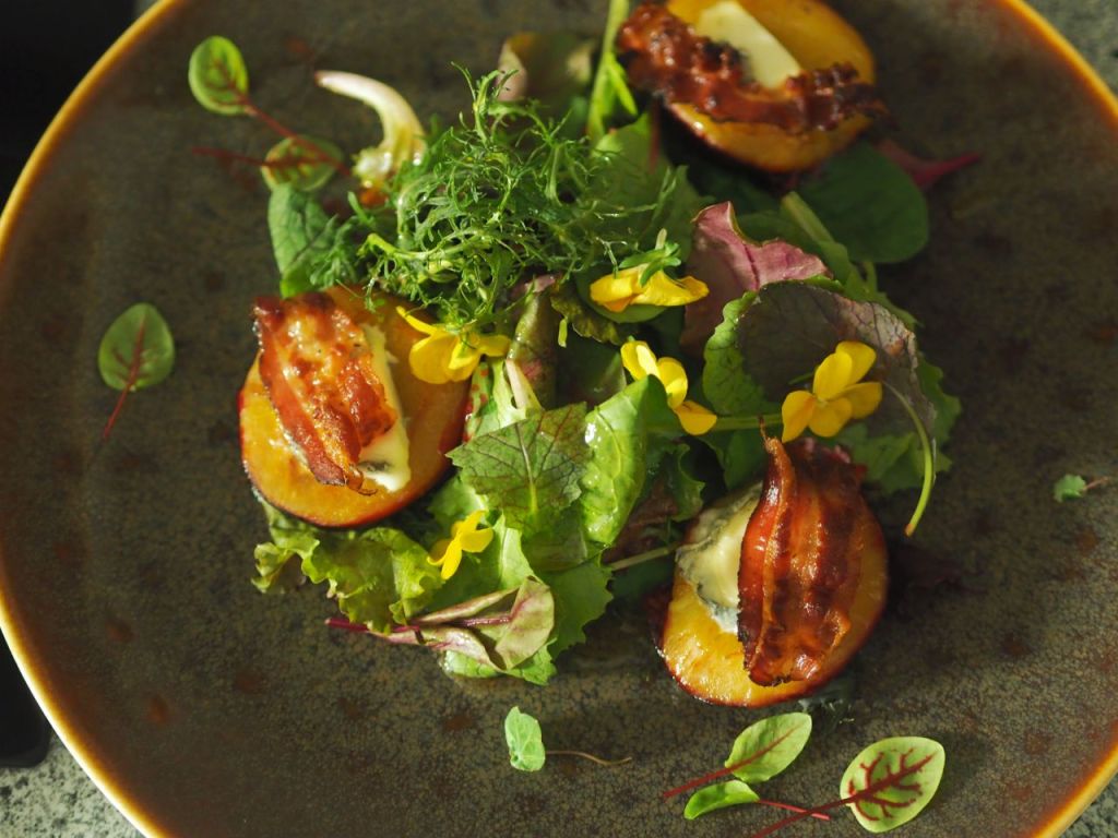 Wildkräutersalat, bestehend aus roter und grüner Mizuna, Red Chard, Baby-Spinat, Senfblatt, roter Pak Choi, Landkresse, Kerbel, Brunnenkresse, Sauerampfer, gelbe Blüten, dazu eine Vinaigrette aus Apfel-Balsam-Essig, Olivenöl und etwas Salz. Zwetschken halbieren, in eine ofenfeste Form legen, mit Olivenöl beträufeln, eine Scheibe vom „Sainte-Maure de Touraine“, einem in Asche gehüllten Ziegenweichkäse belegen, den Käse mit etwas Akazien-Honig beträufeln und im Backrohr bei 180 Grad überbacken. Anrichten Den Wildkräutersalat auf den Teller legen, mit der Vinaigrette beträufeln, die mit Käse überbackenen Zwetschken darauf legen.
