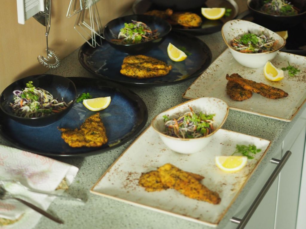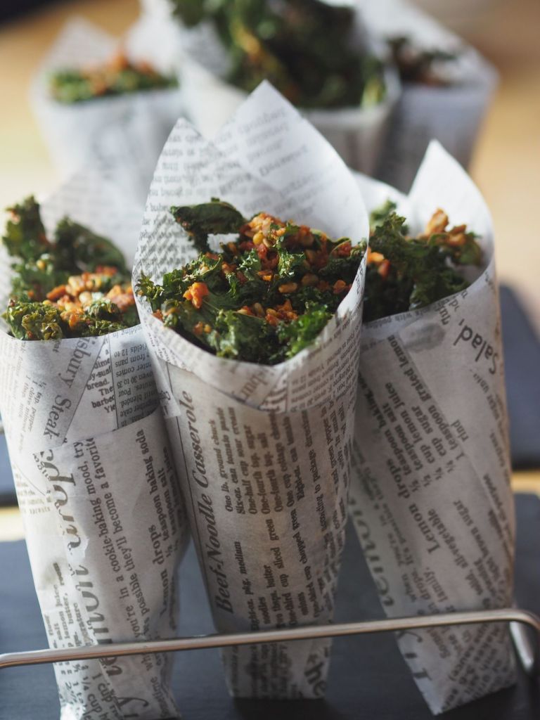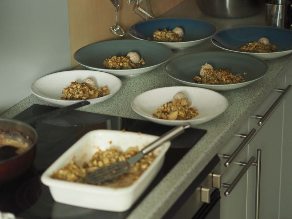 Grünkohlchips im Stanitzl als Empfang zum Aperitif, gefolgt von einer Fünf-Kürbis-Suppe mit frittierten Salbeiblättern, dann mit Ziegenweichkäse überbackene Zwetschken und Wildkräutersalat, als Hauptgang mariniertes Hühner-Schnitzel mit Wurzelgemüsesalat, dann ein lauwarmer Apfel-Crumble mit Mohneis. Abgesehen vom Eis und vom Käse ist alles „paleo-style“.