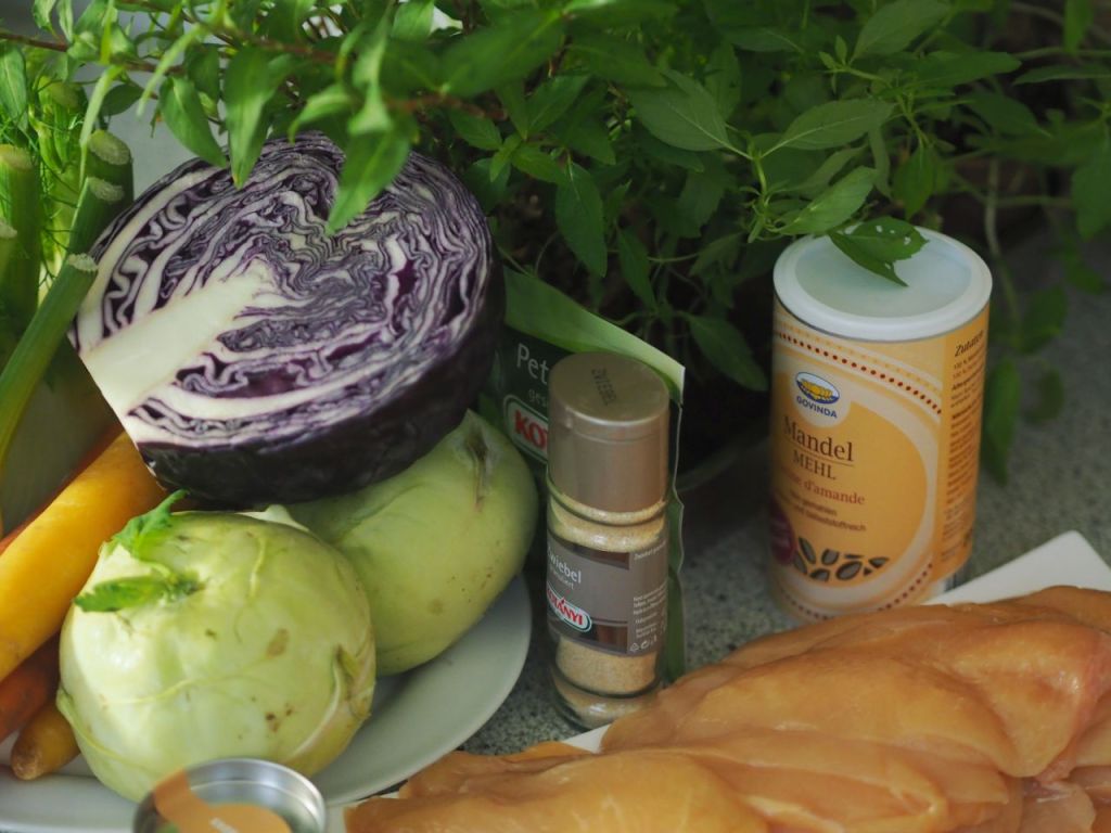 Zutaten für das marinierte Hühner-Schnitzel mit Wurzelgemüsesalat