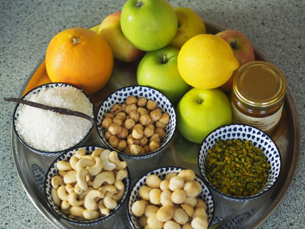 Macadamianüsse, Haselnüsse, Pistazien grob hacken, mit Mandelmehl, Kokosraspel, Akazien-Honig, Vanille und Kokosöl gut verkneten. Apfel und Birne schälen und entkernen. Und zerstückeln. Mit Akazien-Honig, Vanille, dem Abrieb von Orangen und Orangensaft ein paar Minuten köcheln lassen. Das Obst in eine Reine geben, die Nussmischung darauf verteilen, und im Backrohr überbacken, bis die Streusel goldbraun sind.