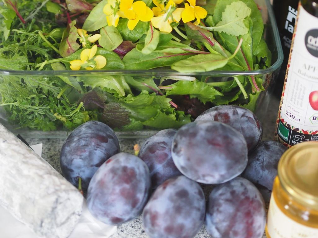 Zutaten für mit Ziegenkäse überbackene Zwetschken und Wildkräutersalat