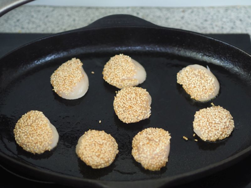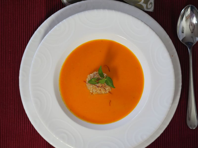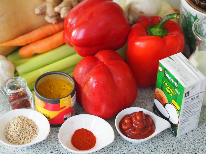 Grob geschnittener Butternusskürbis, weiße Zwiebel, Karotte in Butterschmalz anschwitzen. Geschälte gewürfelte rote Paprika, Staudensellerie dazu geben. Ein paar Minuten mitschwitzen. Geriebenen Ingwer, Paprikapulver, Currypulver, Knoblauchzehe dazugeben. Tomatenmark dazu geben. Mit Gemüsesuppe aufgießen. Etwa eine Viertelstunde köcheln lassen. Pürieren. Schlagobers und Kokosmilch dazu mit Salz und Pfeffer abschmecken. Jakobsmuscheln mit einer Seite in weißen Sesam drücken. Die Jakobsmuscheln in Butterschmalz mit der Sesamseite nach oben anbraten.