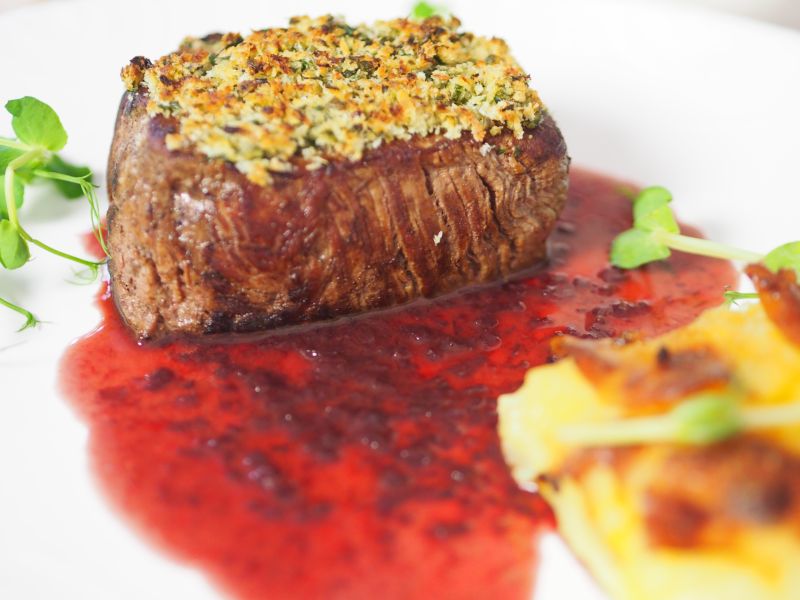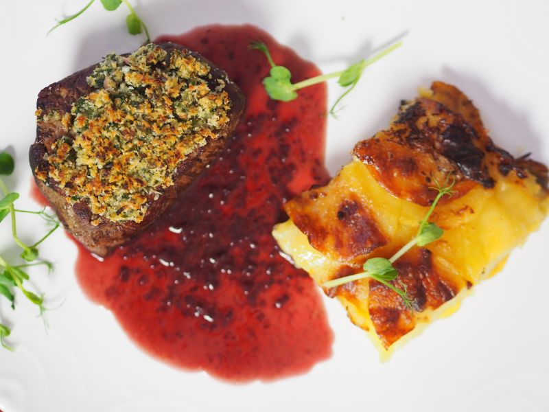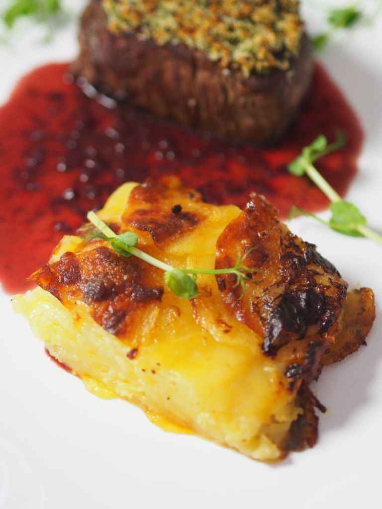Filetsteak mit Kartoffelgratin und Rotweinsauce