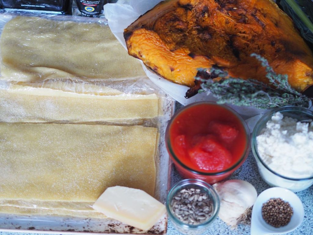 Lasagneblatt 200 Gramm Weizenmehl Typ 405 (entspricht in etwa dem italienischen Tipo 00), 200 Gramm Hartweizengrieß, vier Eier, ein bissi Salz mit einander verkneten und in Frischhaltefolie gewickelt eine halbe Stunde bei Zimmertemperatur ruhen lassen. Anschließend mit dem Nudelgerät den Teig zu Blättern auswalzen. In kochendes Salzwasser geben und zwei Minuten kochen. Abgießen, auf ein Tuch legen und abtropfen lassen. Tomatensauce Fein gehackten Knoblauch in Olivenöl anschwitzen, geschälte ovale Tomaten und Balsamicoessig dazu geben. Die Tomaten etwas zerdrücken. Wasser dazu, mit Salz Pfeffer abschmecken, bei kleiner Hitze eine Viertelstunde bis zwanzig Minuten köcheln lassen, in den letzten fünf Minuten etwas gehackten Thymian dazugeben. Schwarzkohl Die Stiele von den Blättern entfernen, in kochendem Salzwasser blanchieren, abtropfen lassen. Kürbis die gebratenen Kürbisstücke in halbe Zentimeter dicke Scheiben schneiden, mit Salz und gemörserten Korianderkörnern bestreuen. Lasagne in eine feuerfeste Form Tomatensauce gießen, mit Lasagneblatt belegen, nächste Schicht wieder Tomatensauce, dann Schicht auf Schicht: Kürbis, Schwarzkohl, mit Parmesan und dann mit Sonnenblumenkerne bestreuen. Schichten: Lasagneblatt, Tomatensauce, Kürbis, Schwarzkohl, Parmesan, Sonnenblumenkerne, etc. pp. Zum Schluß ein Lasagneblatt und dann: körnigen Frischkäse und ein wenig Milch im Handmixer verrühren, daraus entsteht eine cremige Sauce, damit begießen, mit Parmesan bestreuen, im Backrohr bei 180 Grad backen bis es goldbraun ist, zirka 45 Minuten.