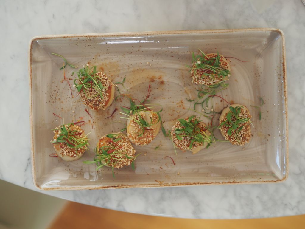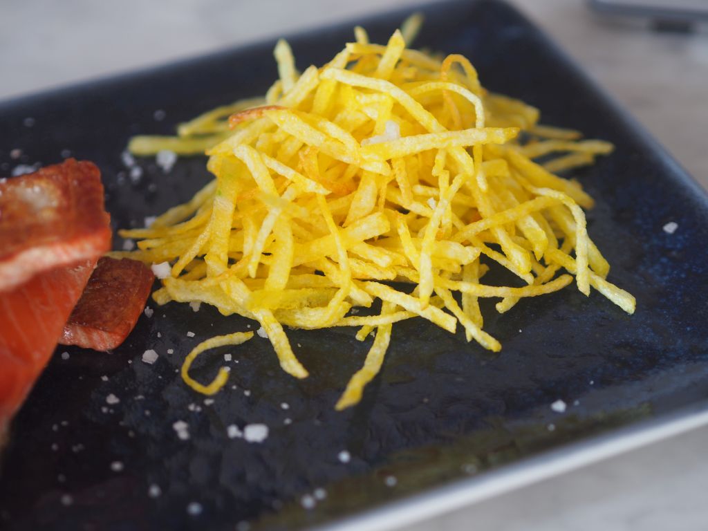 Eine Rindsuppe aufsetzen und 3 Stunden köcheln lassen. Abgießen. Mit der Fetttrennerkanne nur die Brühe nehmen. Diese Brühe soll kräftig sein, Piment, Wacholder, Muskatnuß, Lorbeer, Thymian, Rosmarin verwenden und viel Rindsknochen: 0,8 kg. 2kg Erdäpfel „Laura“ schälen, im Fleischwolf mit dem Aufsatz für Scheiben durchjagen. Ebenso 8 mittelgroße Zwiebel. Die Paella-Pfanne ausbuttern. Die Erdäpfelscheiben fächerweise auflegen, dann eine Schicht Zwiebel. Salzen und mit frisch gehacktem Thymian bestreuen. Dann zwei mal: eine Schicht Erdäpfeln und dann wieder Zwiebel, zum Schluß eine Schicht Erdäpfel. Mit Rinderbrühe begießen. Die Kunst ist, nicht zu wenig Brühe zu nehmen, hängt davon ab, wieviel die Erdäpfel aufnehmen. Bei uns ergab das 600 ml. Ein paar Butterflocken darauf legen und bei 180°C eine Stunde goldbraun backen. Vor dem Servieren mit Mikrogreens Kapuzinerkresse und Radieschensprossen bestreuen.