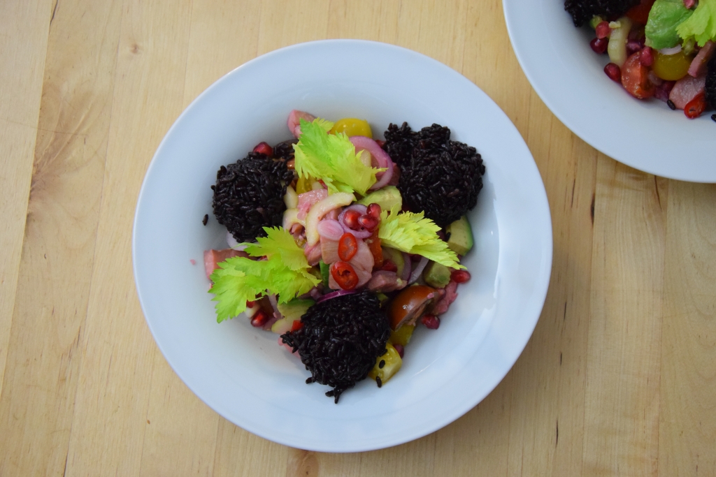 Saurer Lachssalat mit schwarzen Reiskugeln
