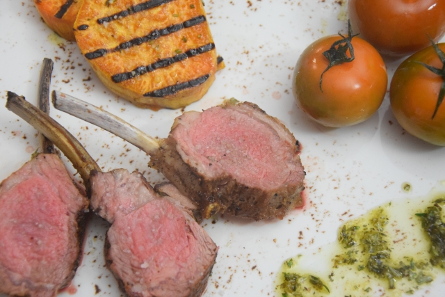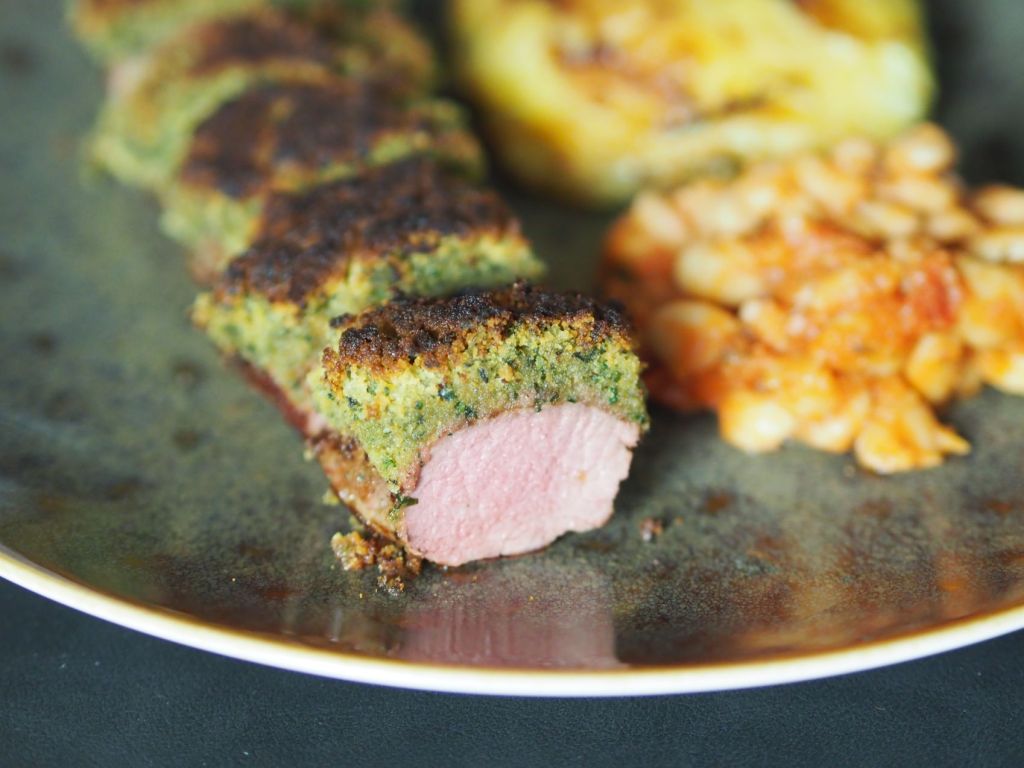 Lammrücken mit Kräuterkruste, Tomaten-Concassée und Kartoffelgratin