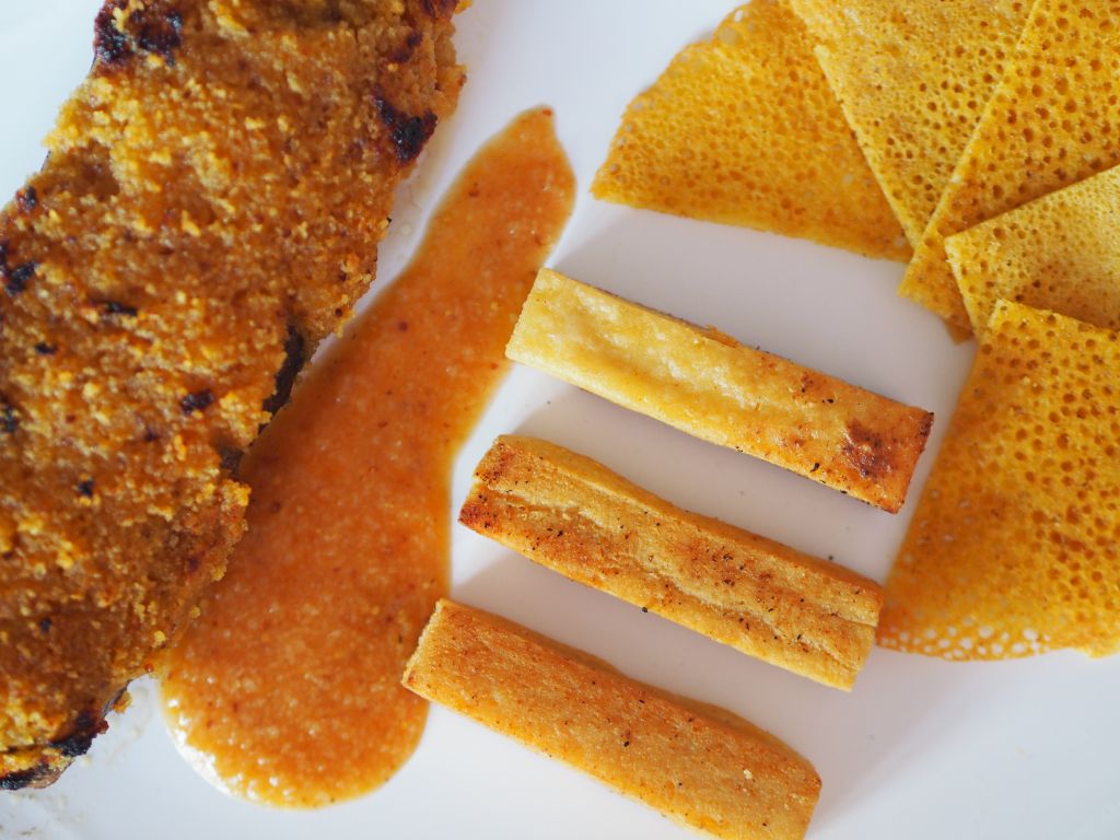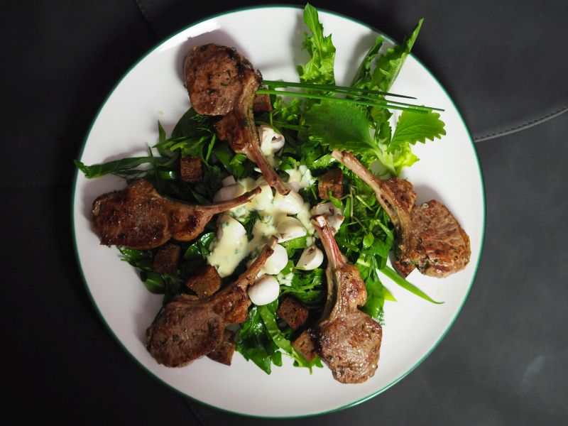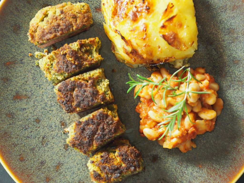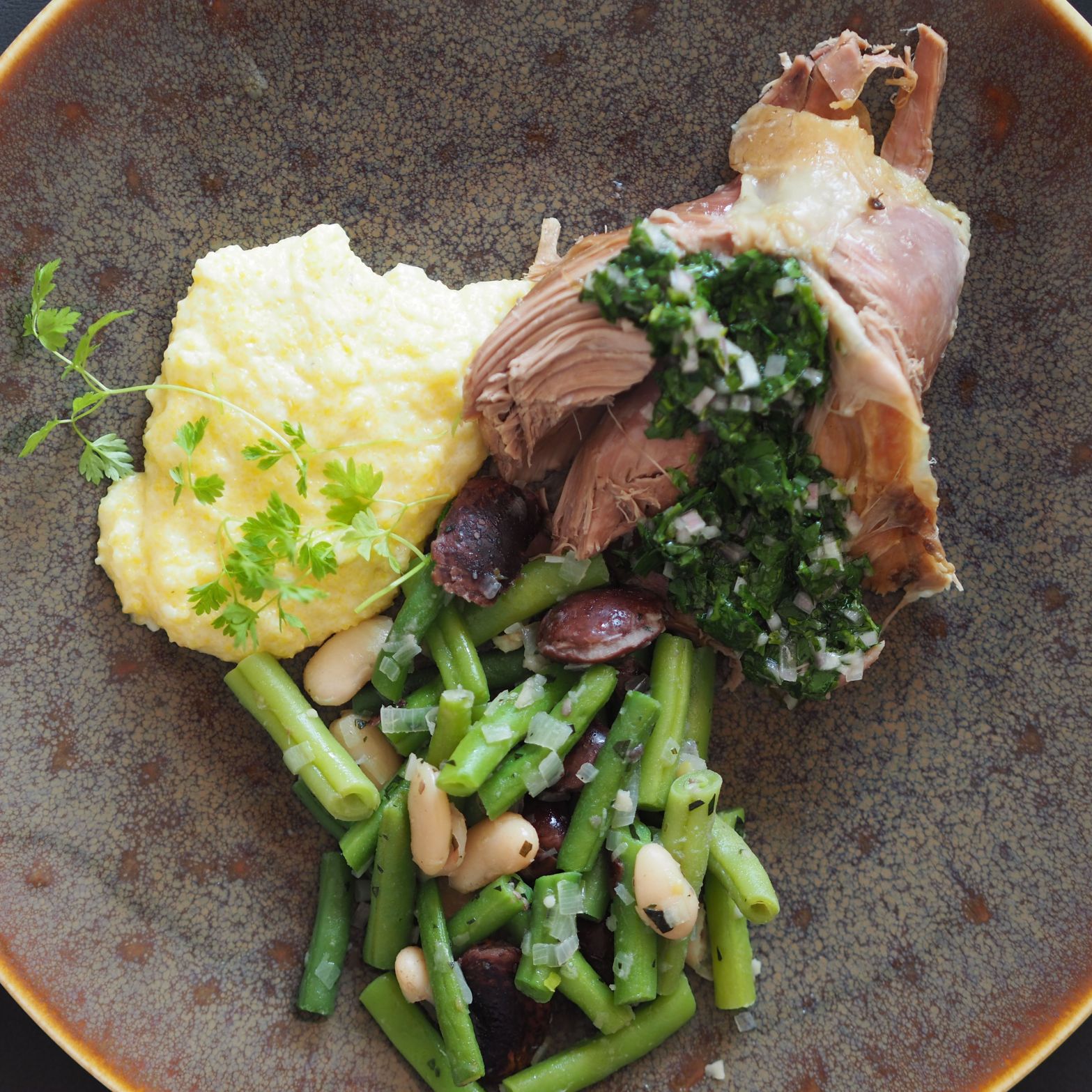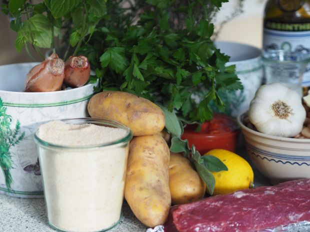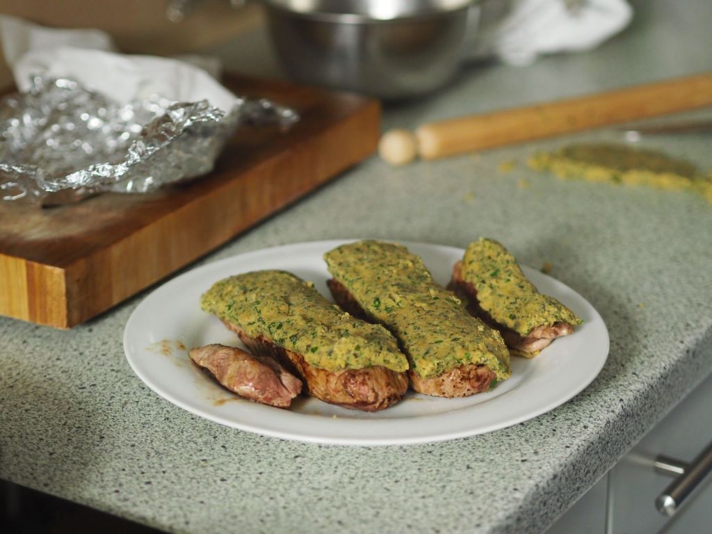 Kartoffel-Gratin Kartoffel schälen, mit der Mandoline in extra dünne Scheiben schneiden (so fein geht das nicht mit der Hand), die Stärke mit Wasser abwaschen, abtrocknen. Eine der Béchamel ähnliche Sauce nur ohne Mehl, damit sie sich nicht bindet und sich in die rohen Kartoffeln reinsaugt und durchgart: fein gehackte Schalotten in Butter anschwitzen, mit Pernod ablöschen, mit Schlagobers aufgießen, mit Salz und Pfeffer Muskatnuss abschmecken, kann ruhig etwas zu salzig sein, weil die rohen Kartoffeln das ansaugen. In eine feuerfeste, mit Butter ausgeschmierten Form eine Reihe Kartoffelscheiben einlegen, mit der Schlagobersmischung beträufeln, nächste Kartoffelschicht, etc. pp. Im Backrohr bei 180 Grad zirka 30 bis 40 Minuten anbraten. Für die Kruste weiche Butter mit Dotter schaumig rühren, fein gehackte Petersilie, Salbei, Thymian, Rosmarin, Minze und fein geriebene Knoblauchzehen einrühren, zum Schluss Semmelbröseln einrühren bis zur weiteren Verwendung im Kühlschrank ziehen lassen. Tomaten-Concassée fein gehackte Schalotten in Olivenöl anschwitzen, Tomaten-Concassée dazu geben, fein gehackten Thymian, Rosmarin und Salz dazu geben, 10 Minuten köcheln lassen, die abgetropften Riesenbohnen einrühren, eine weitere Viertelstunde ziehen lassen. Lammlachs von allen Seiten in der Pfanne scharf anbraten, aus der Pfanne nehmen. Für die Kräuterkruste die Butter-Kräuter-Masse auf eine Frischhaltefolie geben, mit einer Frischhaltefolie bedecken, sodann mit einem Nudelholz auswalken, die obere Frischhaltefolie entfernen, den Lammlachs darauf legen und das Stück darunter ausschneiden, sodass man ein mit der Größe des Lammlachses übereinstimmendes Stück bekommt. Damit den Lammlachs bedecken, so mit allen Lammlachsen vorgehen und dann diese auf einem Teller liegend ins Backrohr schieben, auf zirka 90 Grad drehen, mit Hitze von oben, etwa 10 Minuten bis eine Viertelstunde lang.