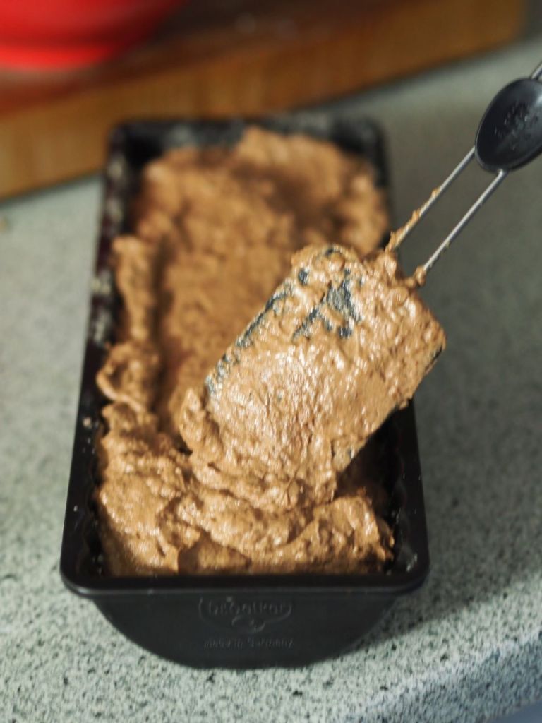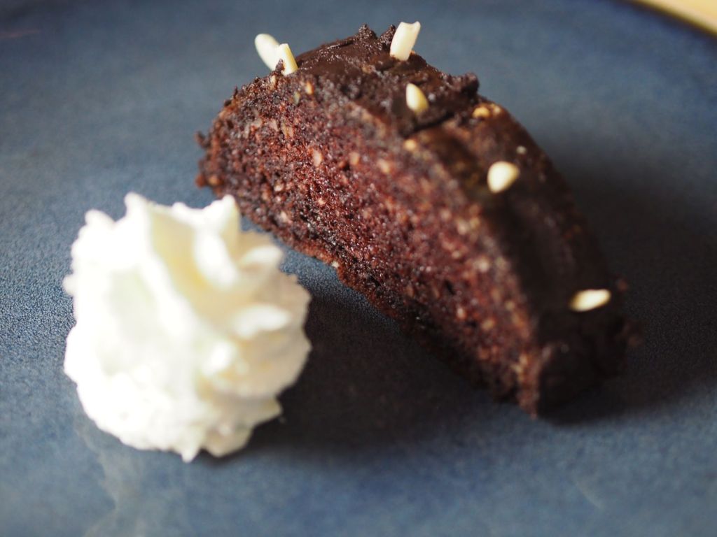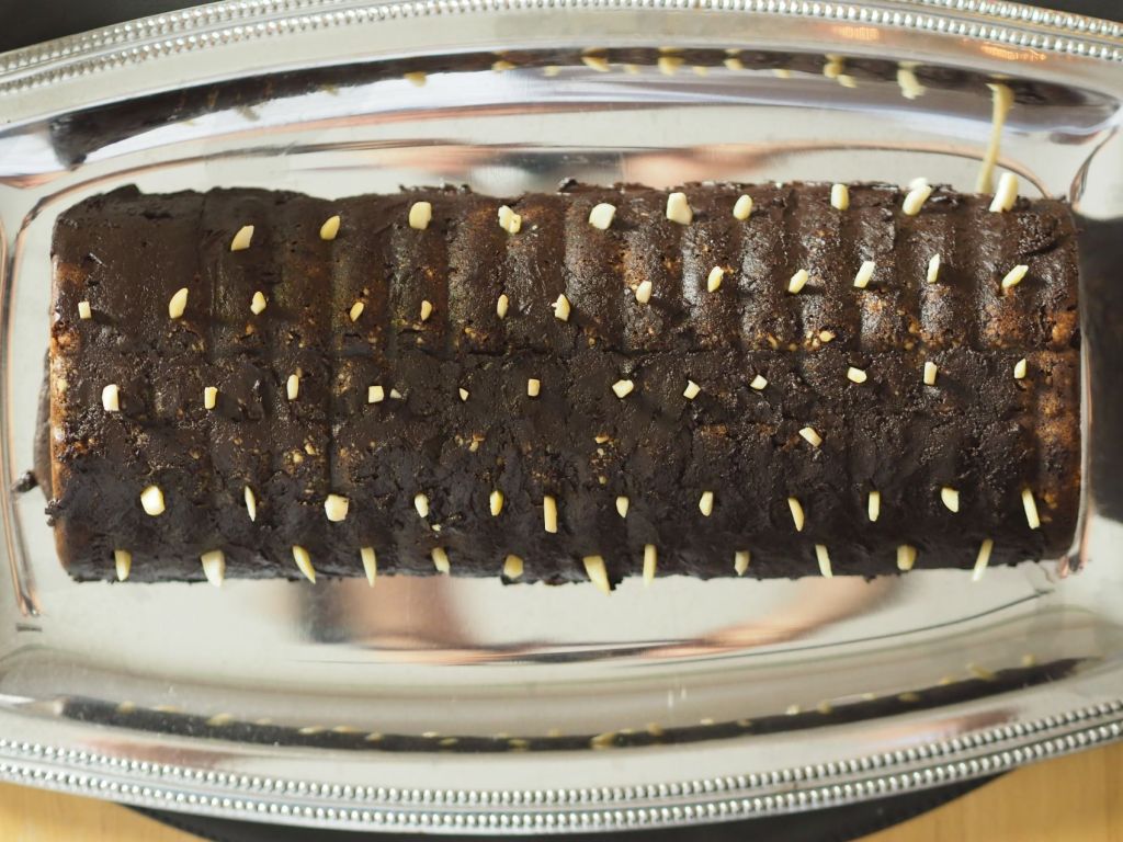 12 dkg Butter mit 10 dkg Zuckerersatz (Erythrit), dem Mark einer halbe Vanilleschote und mit dem Abrieb einer Zitronenschale schaumig rühren. 10 dkg im Wasserbad geschmolzene siebzigprozentige Schokolade einträufeln, unter ständigem Rühren. Sechs Eier trennen, die Eidotter einzeln in die Butter-Schokolade-Mischung einrühren, das Eiklar in einer Prise Salz zu einem steifen Schnee schlagen. 16 dkg gemahlene Mandeln, die Butter-Mischung, eine halbe Packung Backpulver verrühren. Zum Schluss das Eiklar mit dem Gummihund vorsichtig unterrühren. Diese Masse nun in eine Rehrückenform geben und im Backrohr bei 160 Grad zirka 50 Minuten backen, wobei der Kuchen nach etwa 20 Minuten mit einer Folie abgedeckt wird, um zu vermeiden, dass er zu dunkel wird. Den Kuchen herausnehmen und auskühlen lassen. Weitere 10 dkg siebzigprozentige Schokolade im Wasserbad schmelzen lassen, weiche Butter einrühren und damit den Kuchen begießen, warten bis es fest wird und mit Mandelstiften versetzen.